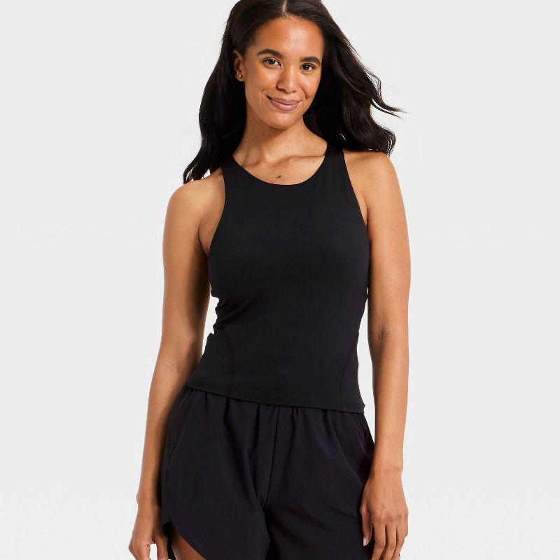 Why we're ALL IN:Super flex high-neck tank top in a fitted silhouette features a built-in shelf bra. Crafted from recycled polyester-spandex blend interlock fabric with lining for comfortable wear tha…
