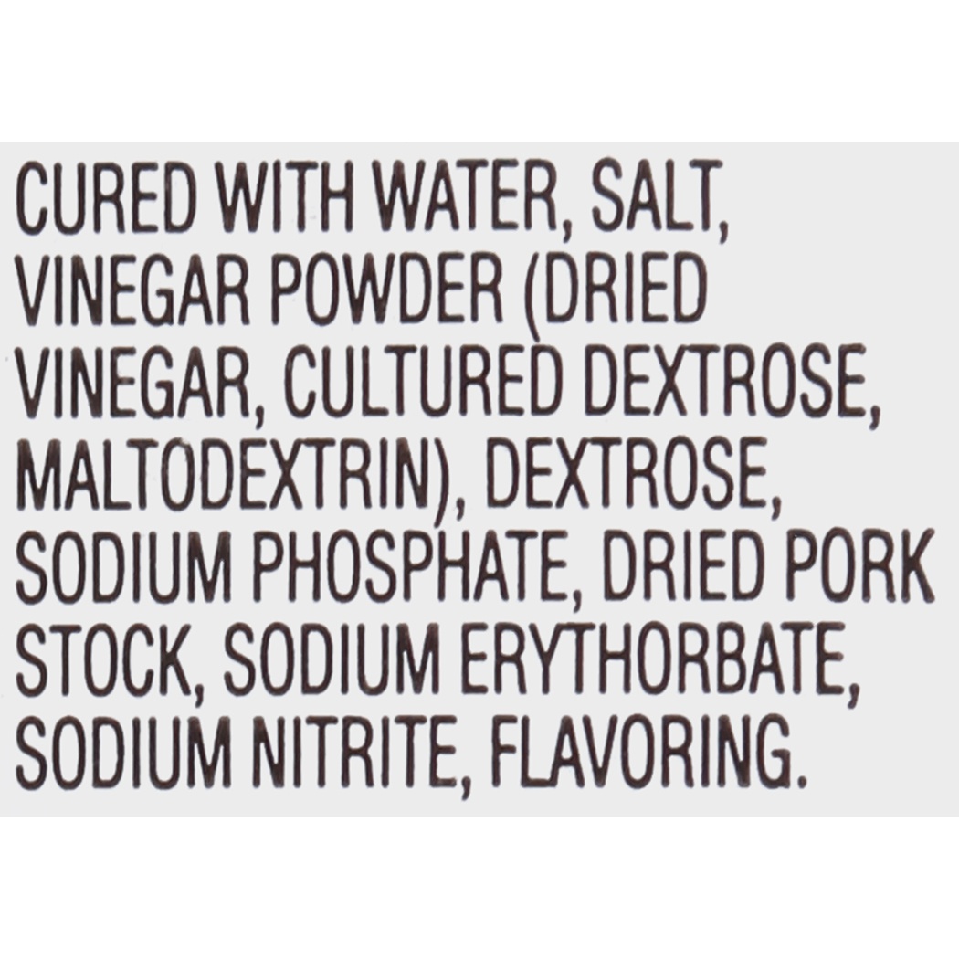 Cured With Water, Sea Salt, Vinegar Powder (Dried Vinegar, Cultured Dextrose, Maltodextrin), Dextrose, Sodium Phosphate, Dried Pork Stock, Sodium Erythorbate, Sodium Nitrite, Flavoring.
