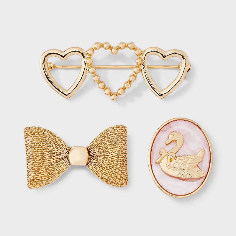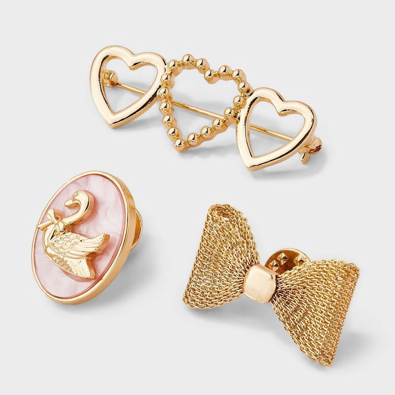 Three-piece pin set from Wild Fable™. Includes a triple heart-shaped pin, bow pin and swan pin, all with gold-tone finishes. Postback closures help keep the pins securely in place.If you're not satisf…