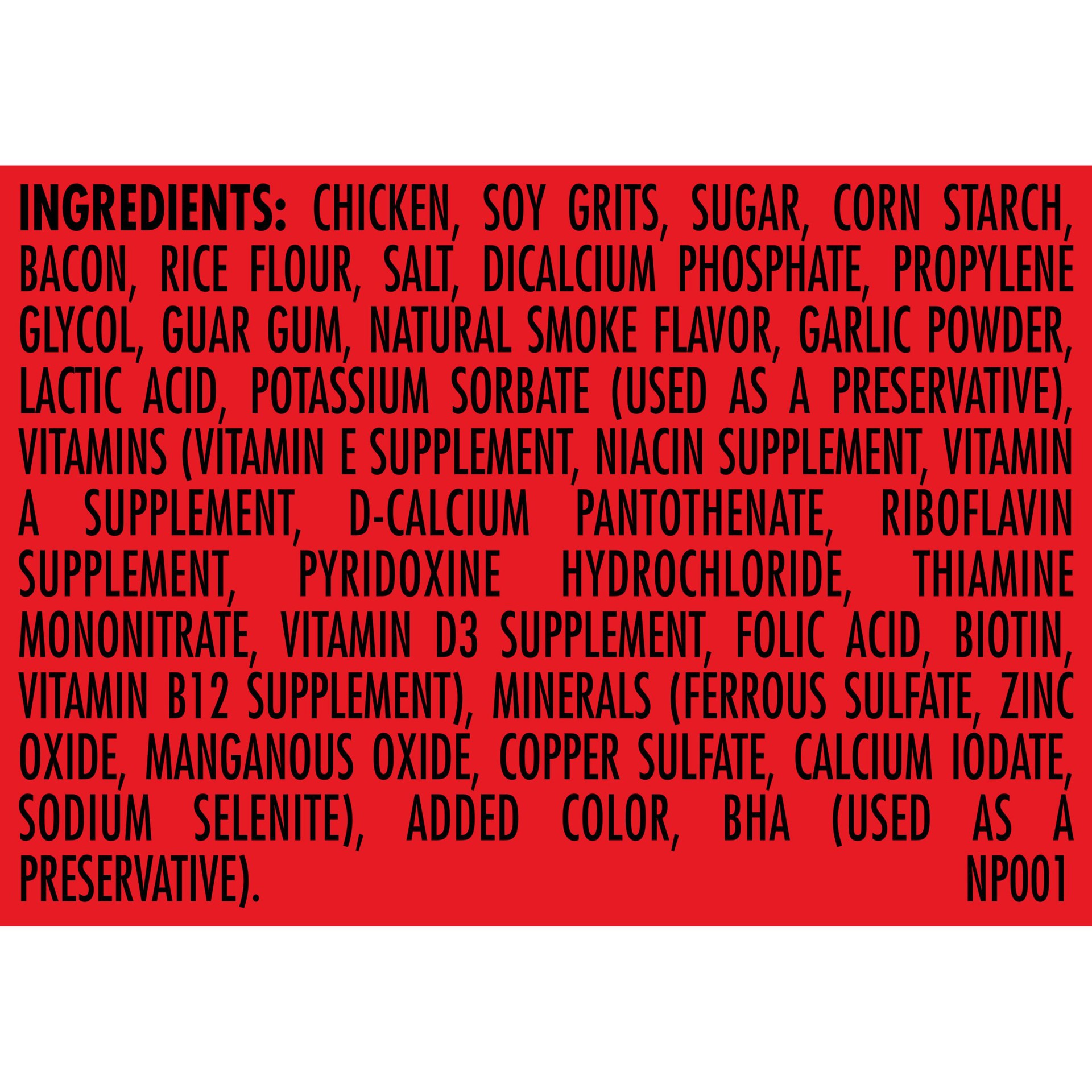 Chicken, Soy Grits, Sugar, Corn Starch, Bacon, Rice Flour, Salt, Dicalcium Phosphate, Propylene Glycol, Guar Gum, Natural Smoke Flavor, Garlic Powder, Lactic Acid, Potassium Sorbate (Used as a Preserv…