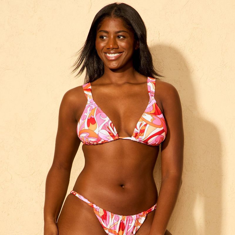 Triangle bikini top from Wild Fable™ features a wireless design with a V-neckline, medium coverage and wide front straps. Made from recycled polyester fabric with spandex and full lining with four-way…