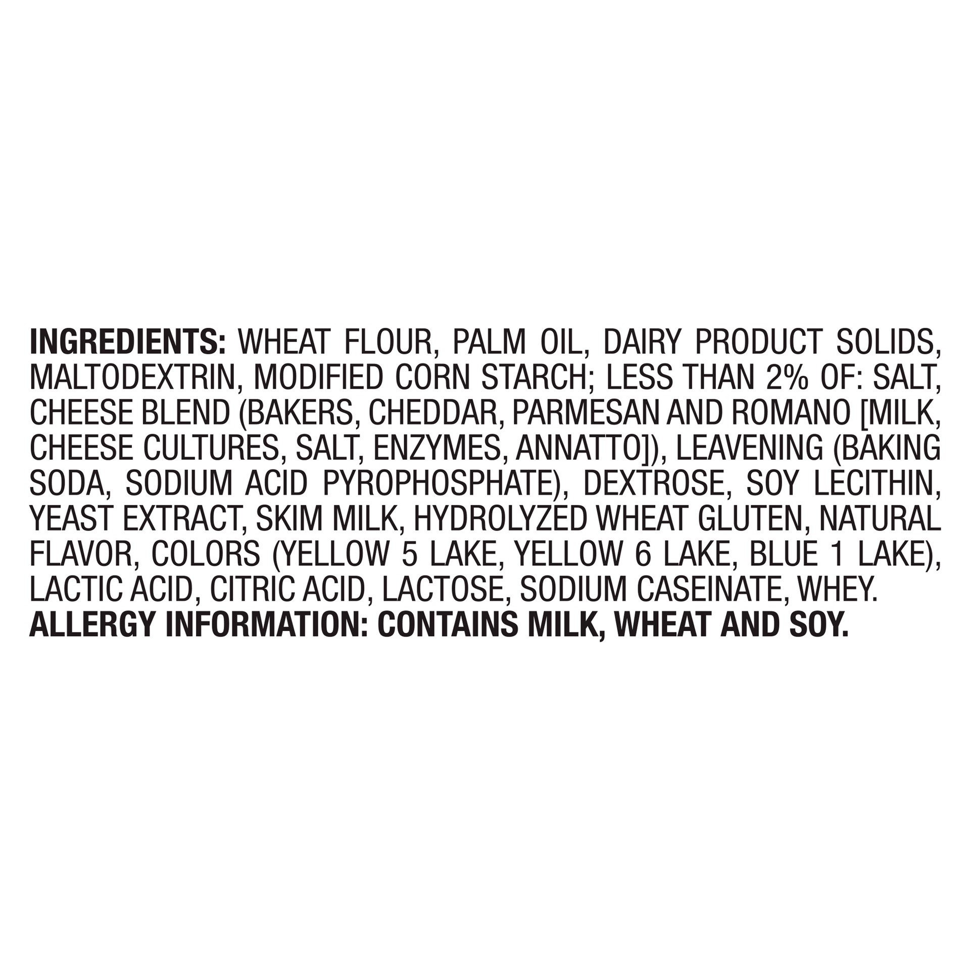 Wheat Flour, Palm Oil, Dairy Products Solids, Maltodextrin, Modified Corn Starch; Less than 2% of: Salt, Cheese Blend (Bakers, Cheddar, Parmesan and Romano [Milk, Cheese Cultures, Salt, Enzymes, Annat…