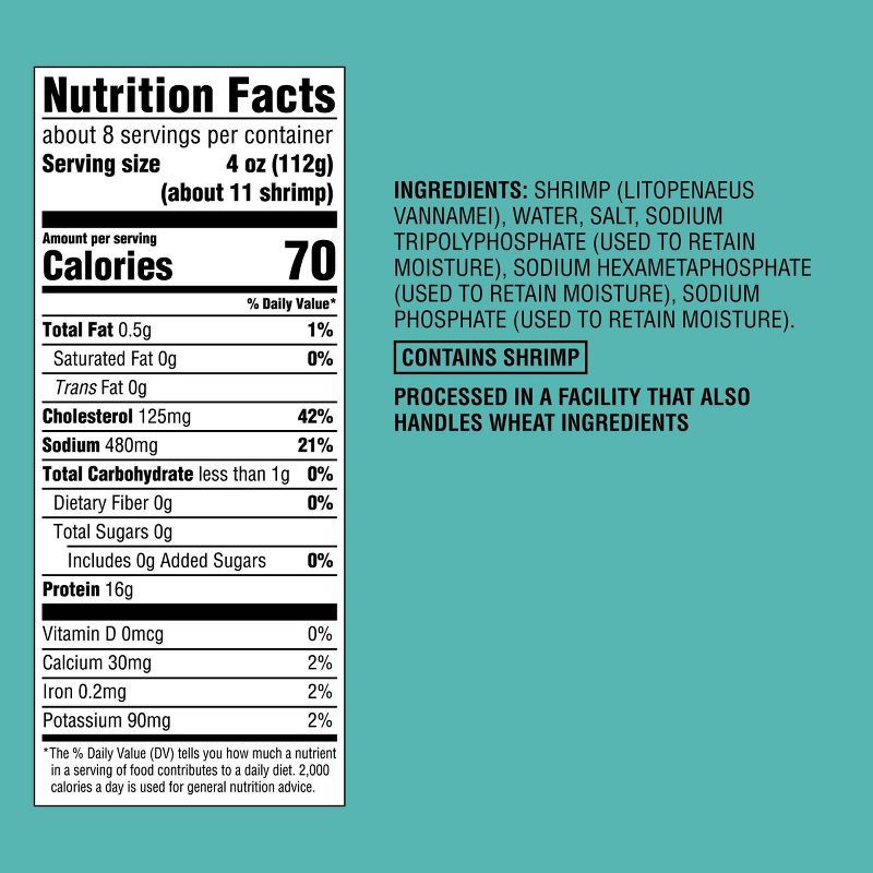 SHRIMP (LITOPENAEUS VANNA- MEI), WATER, SALT, SODIUM TRIPOLYPHOS- PHATE (USED TO RETAIN MOISTURE), SODIUM HEXAMETAPHOSPHATE (USED TO RETAIN MOIS- TURE), SODIUM PHOSPHATE (USED TO RETAIN MOISTURE).