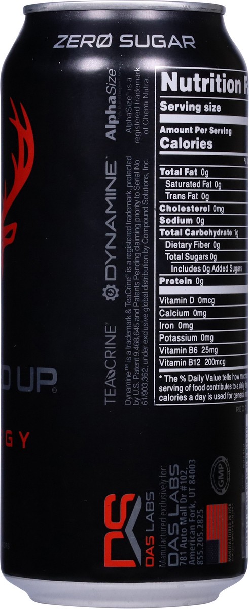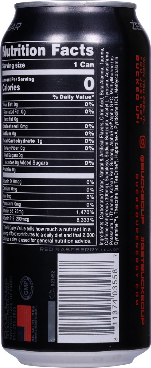 Red raspberry flavor. Natural & artificial flavors. Zero sugar. Each serving contains 300 mg of caffeine. When you feel it - you just got Bucked Up! Teacrine. Dynamine. Alpha size. GMP: Good Manufactu…