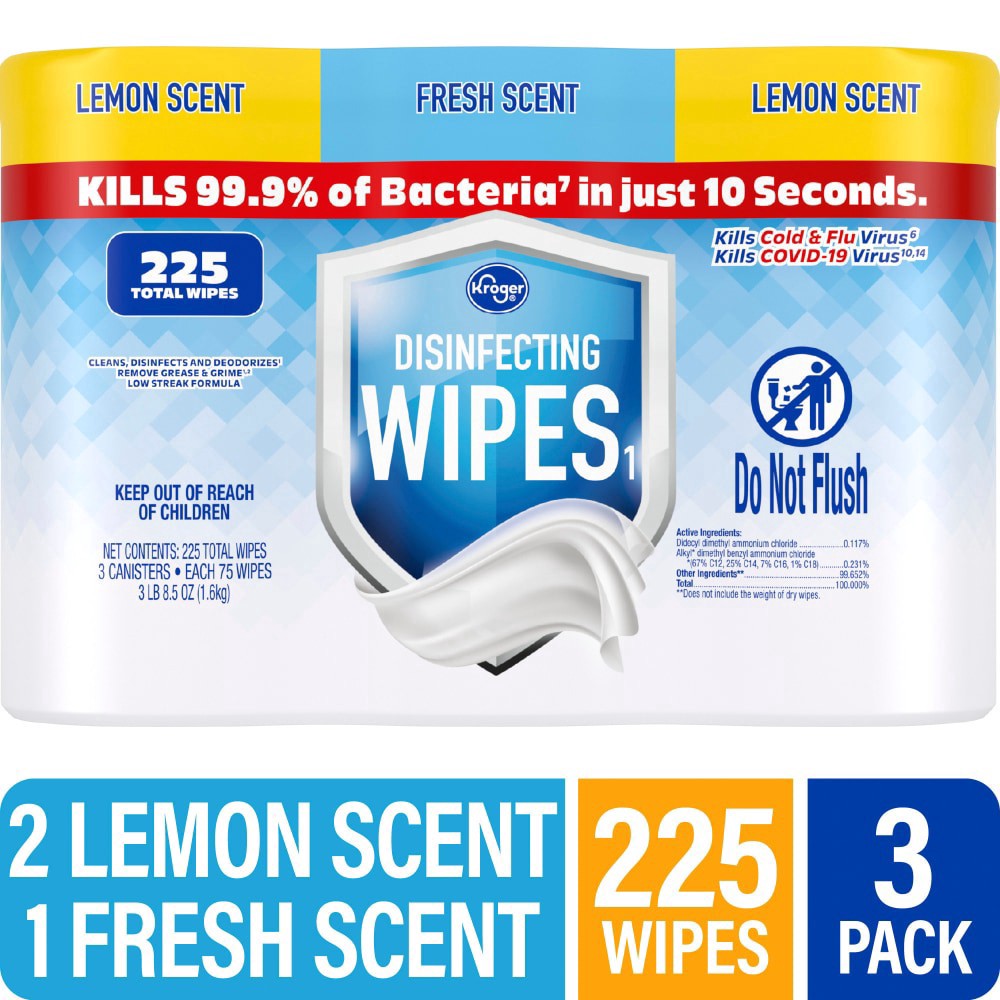 Kroger® Lemon Scent & Fresh Scent Disinfecting Wipes Multipack keeps surroundings cleaner with two Lemon-scented packs and one Fresh scent! With these wipes you can kill 99.9% of bacteria in just 10 s…