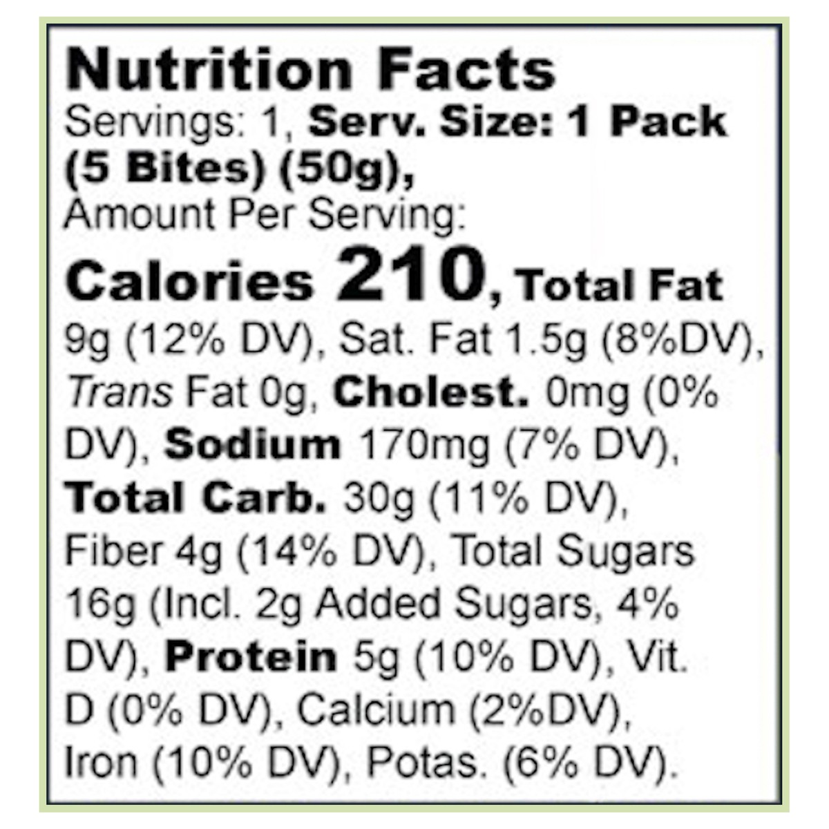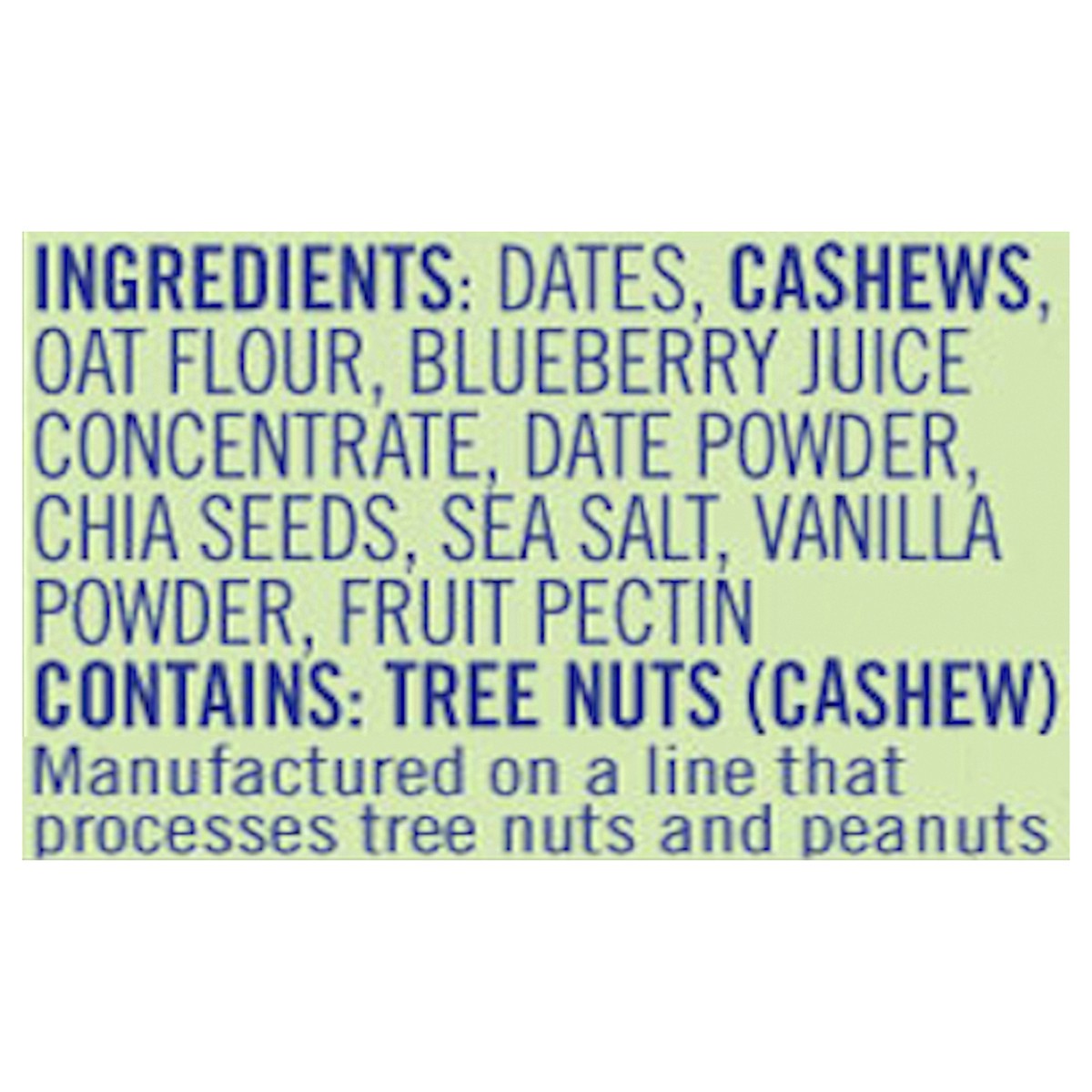 Dates, Cashews, Oat Flour, Blueberry Juice Concentrate, Date Powder, Chia Seeds, Sea Salt, Vanilla Powder, Fruit Pectin.