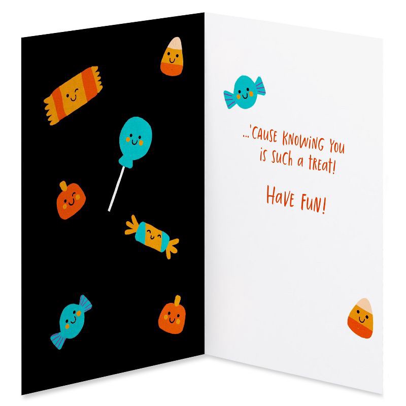 Bring a smile to their face this Halloween with a card that's as sweet as they are! Featuring charming candy characters on a vibrant dark background, this card delivers a playful message inside that r…