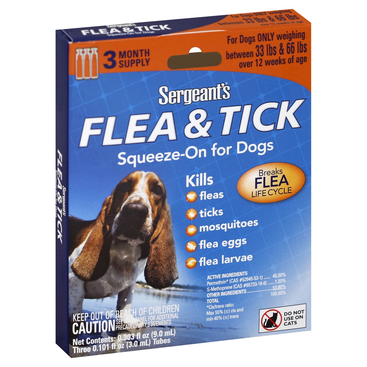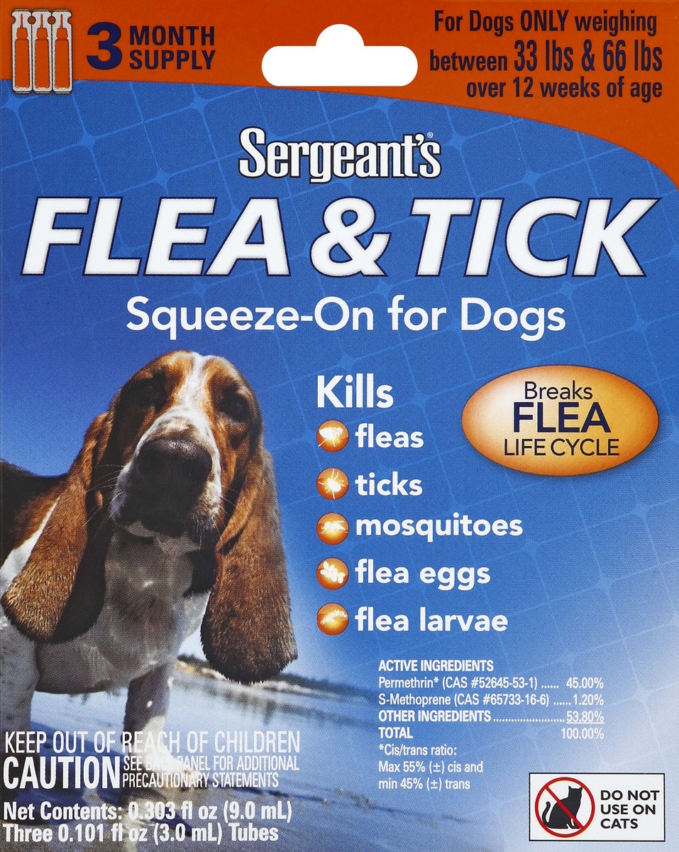 3 month supply. For dogs only weighing between 33 lbs and 66 lbs over 12 weeks of age. Breaks flea lifecycle. Kills fleas; ticks; mosquitoes; flea eggs; flea larvae. If you have questions or comments …