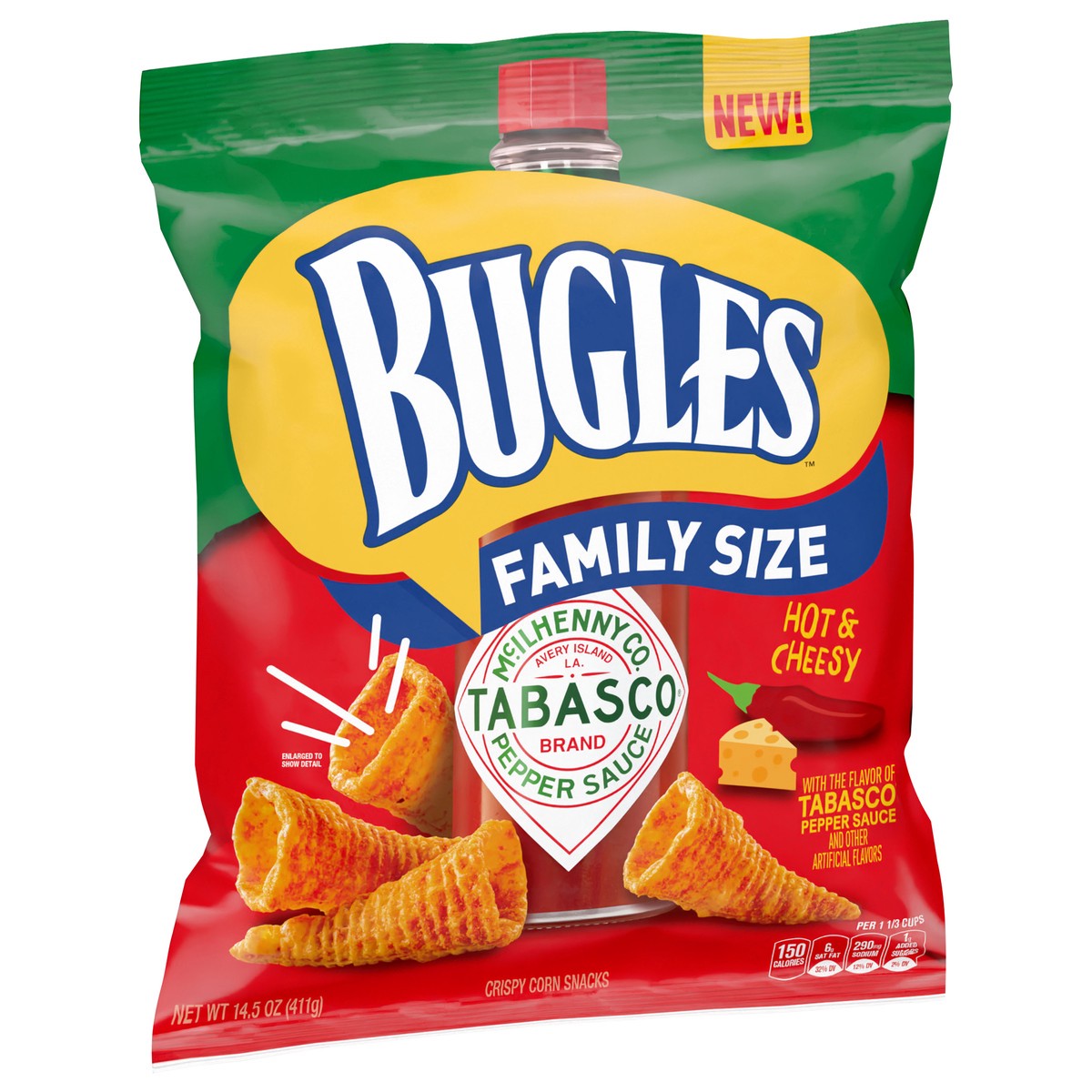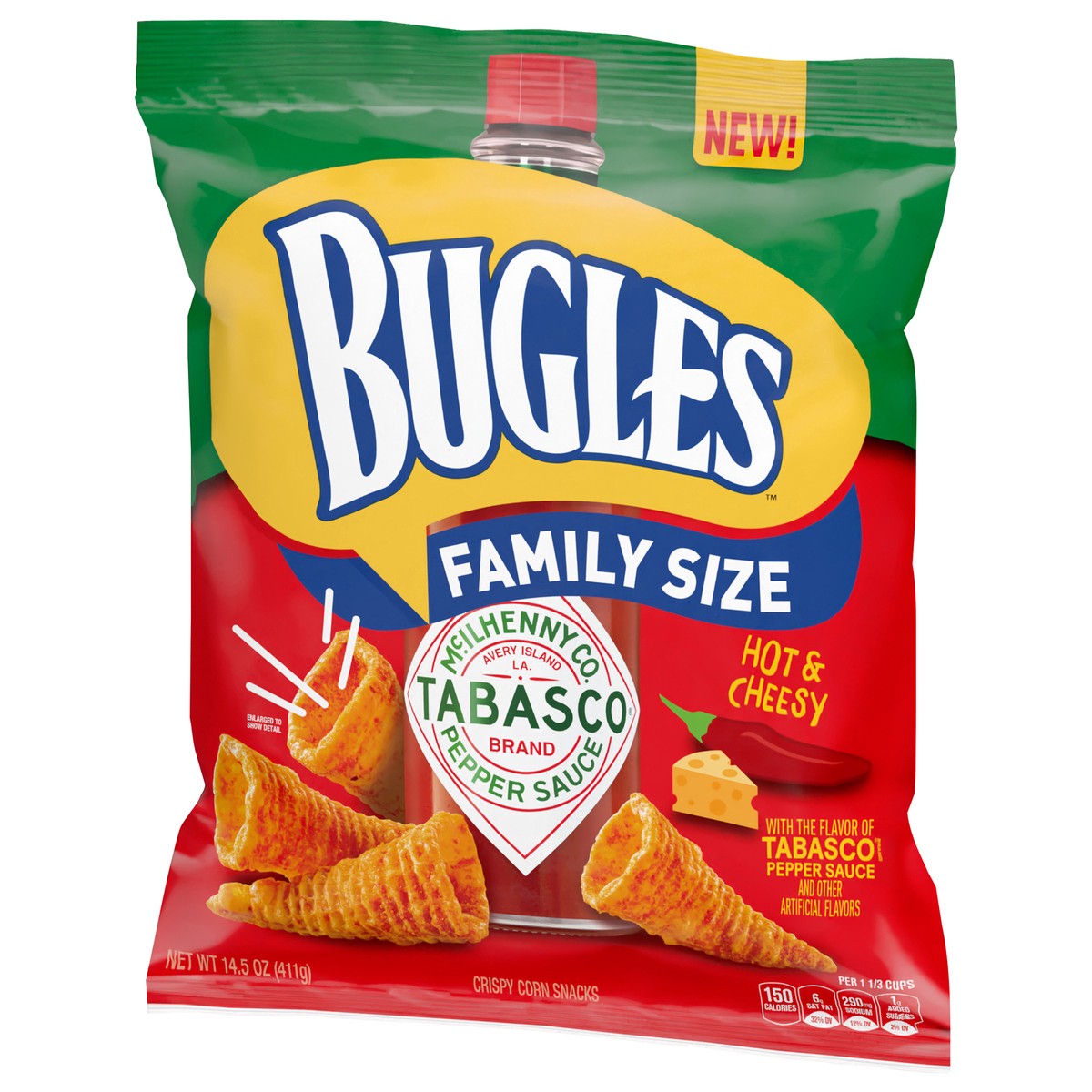 Bugles Tabasco Flavored Crispy Corn Snacks, Hot and Cheesy, Family Size, 14.5 oz