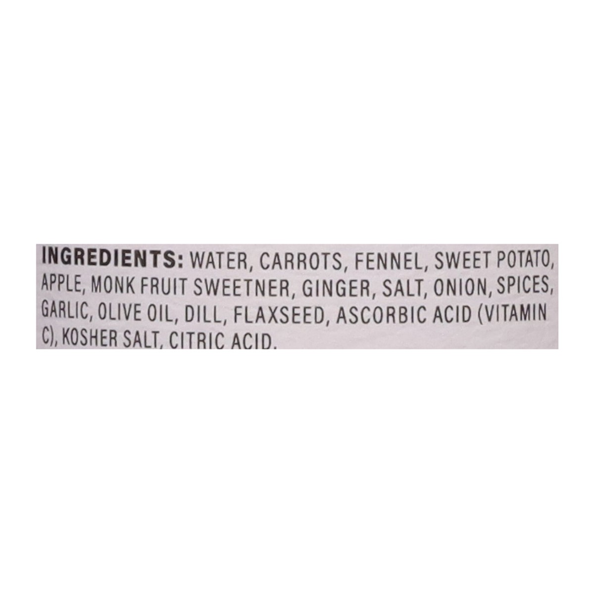 Water, Carrots, Fennel, Sweet Potato, Apple, Monk Fruit Sweetner, Ginger, Salt, Onion, Spices, Garlic, Olive Oil, Dill, Flaxseed, Ascorbic Acid (Vitamin C), Kosher Salt, Citric Acid.