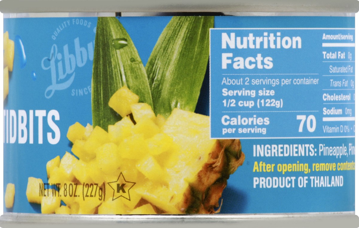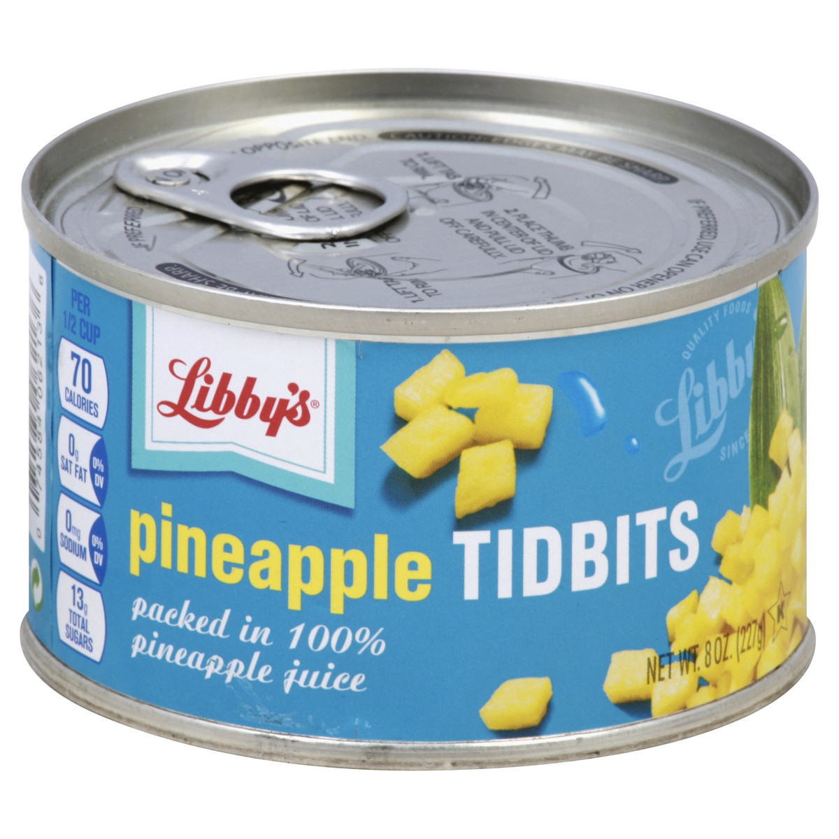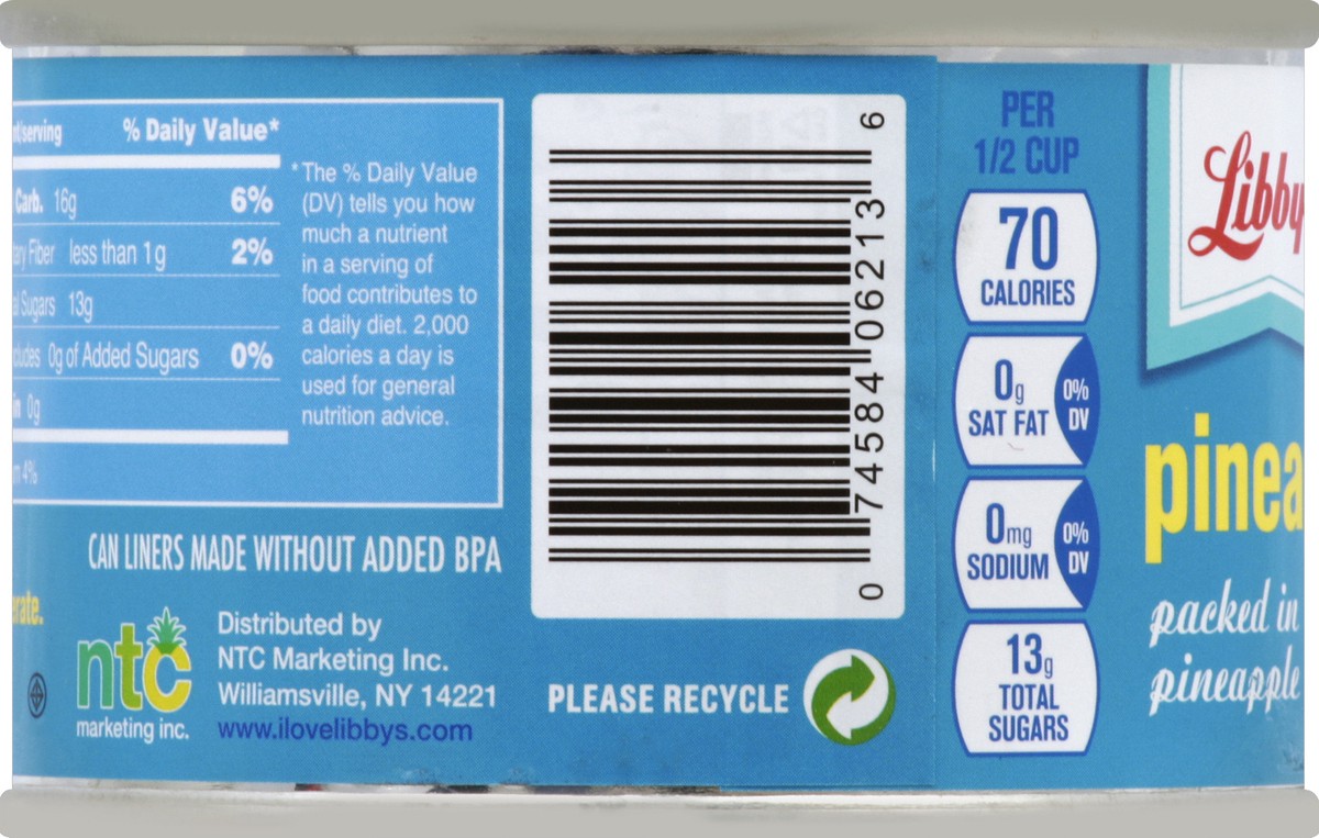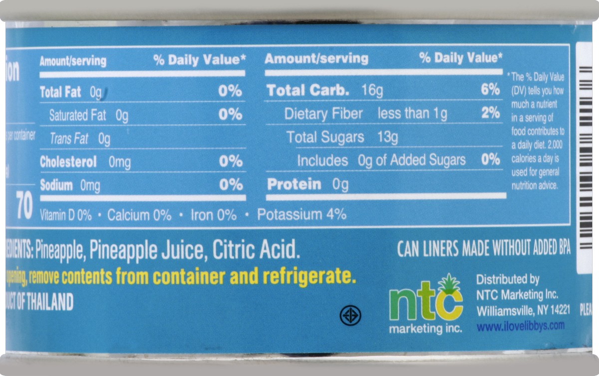 Packed in 100% pineapple juice. Per 1/2 Cup: 70 calories; 0 g sat fat (0% DV); 0 mg sodium (0% DV); 13 g total sugars. Can liners made without added BPA. www.ilovelibbys.com. Please recycle. Product o…