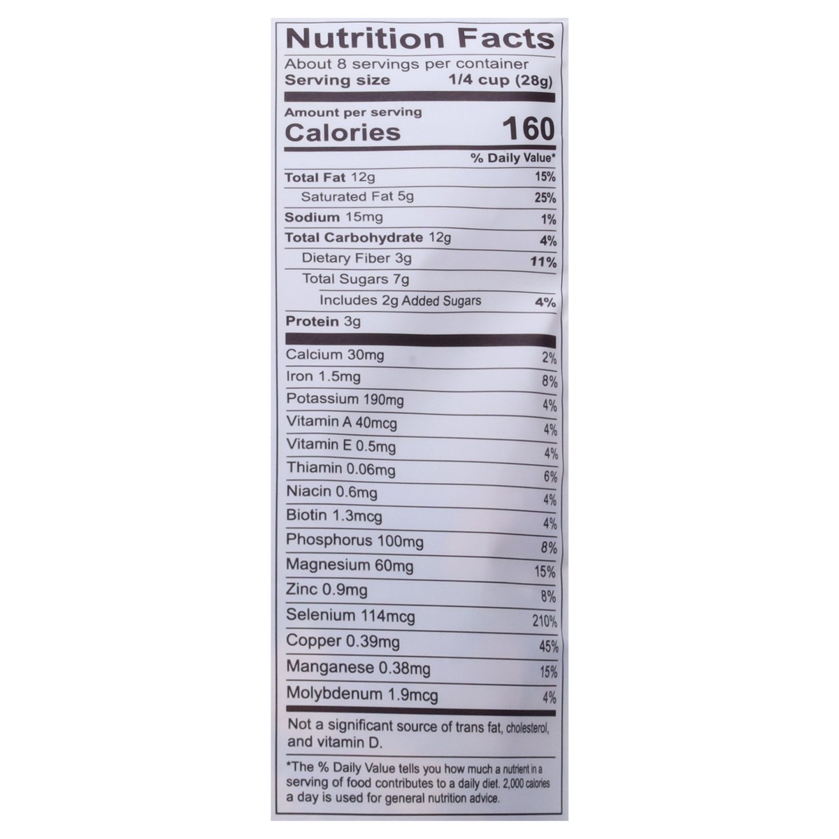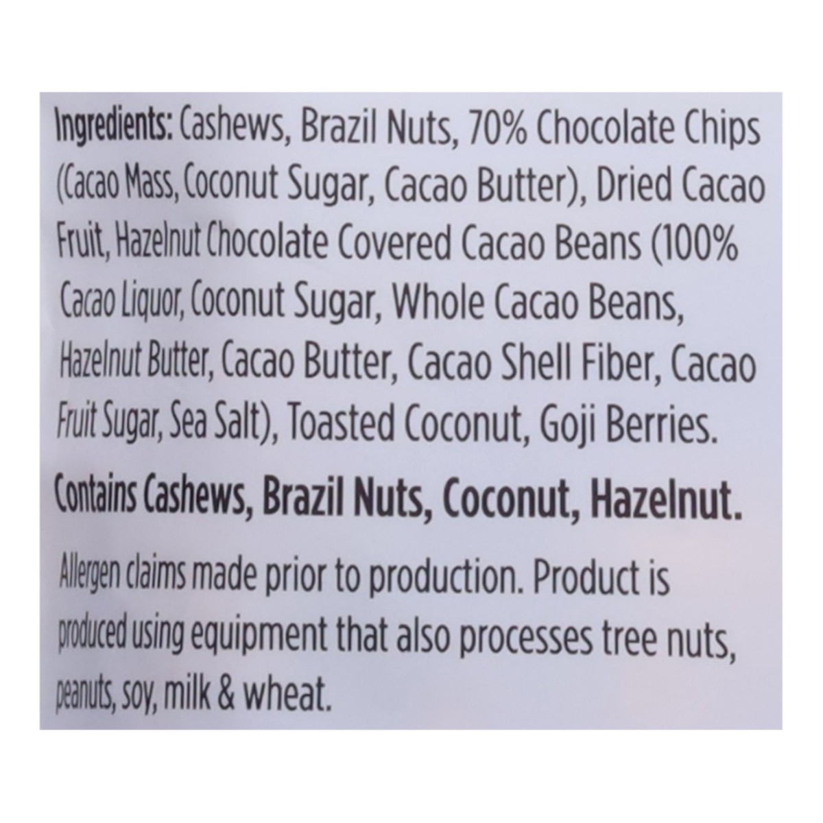 Contains cashews, brazil nuts, coconut, hazelnut. allergen claims made prior to production. product is produced using equipment that also processes tree nuts, peanuts, soy, milk & wheat.