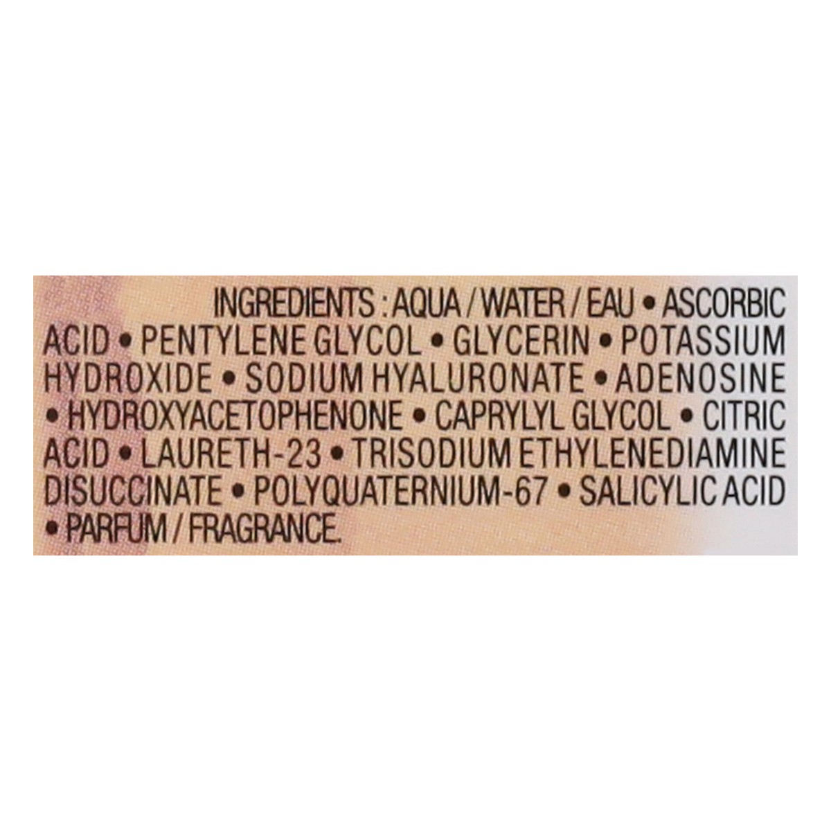 Aqua/Water/Eau, Ascorbic Acid, Pentylene Glycol, Glycerin, Potassium Hydroxide, Sodium Hyaluronate, Adenosine, Hydroxyacetophenone, Caprylyl Glycol, Citric Acid, Laureth-23, Trisodium Ethylenediamine …