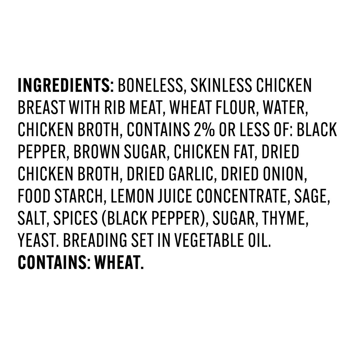 Boneless, Skinless Chicken Breast with Rib Meat, Wheat Flour, Water, Chicken Broth, Contains 2% or Less of: Black Pepper, Brown Sugar, Chicken Fat, Dried Chicken Broth, Dried Garlic, Dried Onion, Food…