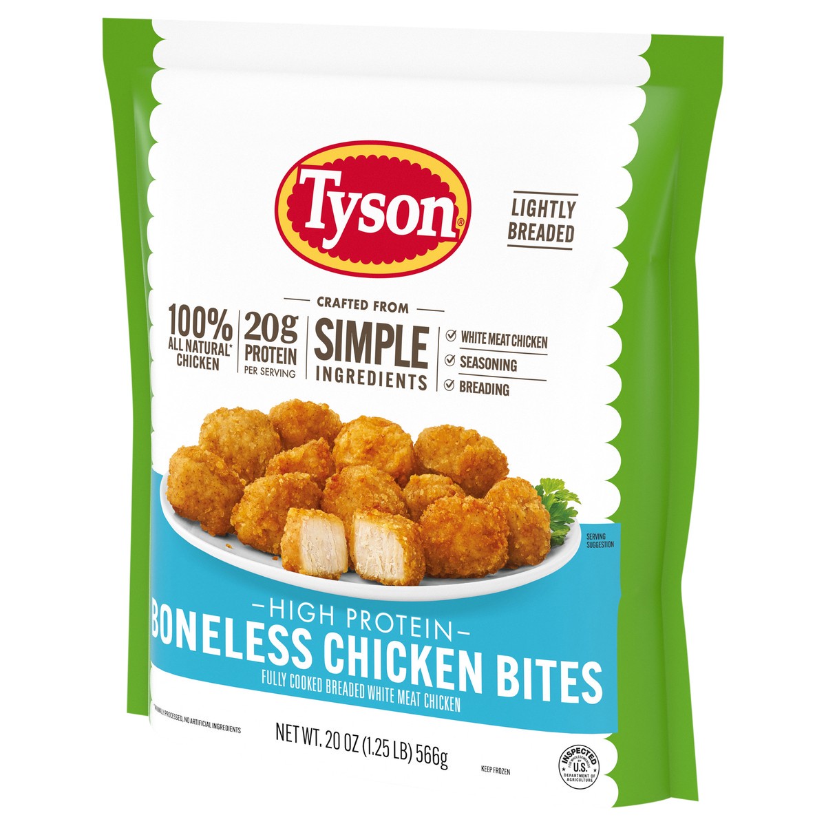 Flavorful and delicious, Tyson Lightly Breaded Boneless Chicken Bites are a welcome addition to any family meal. Lightly breaded with no added hormones or steroids**, our frozen white meat chicken bit…