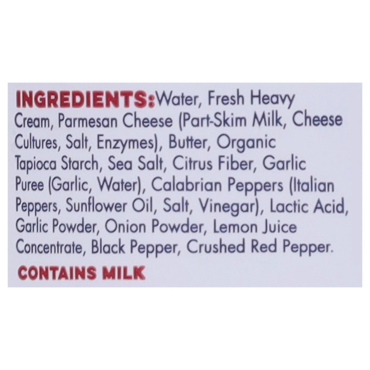 Water, Fresh Heavy Cream, Parmesan Cheese (Part-Skim Milk, Cheese Cultures, Salt, Enzymes), Butter, Organic Tapioca Starch, Sea Salt, Citrus Fiber, Garlic Puree (Garlic, Water), Calabrian Peppers (Ita…