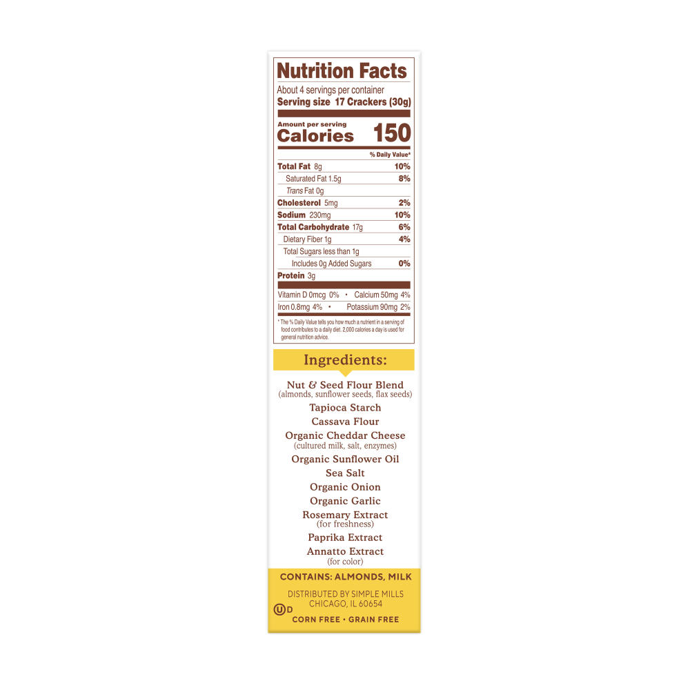 Nut & Seed Flour Blend (Almonds, Sunflower Seeds, Flax Seeds), Tapioca Starch, Cassava Flour, Organic Cheddar Cheese (Cultured Milk, Salt, Enzymes), Organic Sunflower Oil, Sea Salt, Organic Onion, Org…