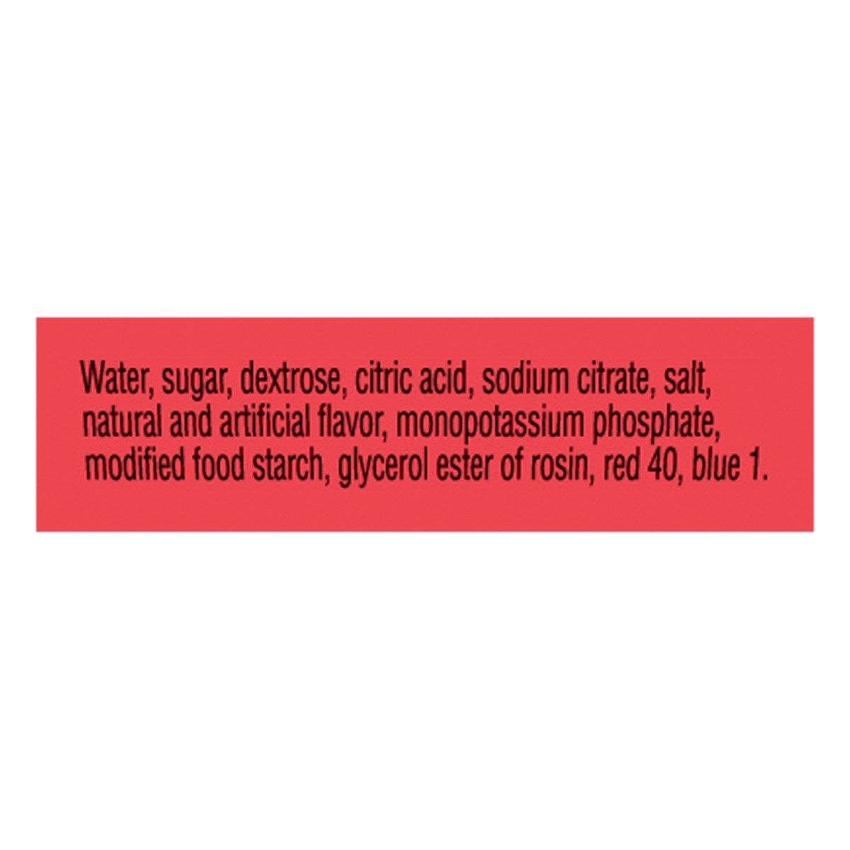 Water, Sugar, Dextrose, Citric Acid, Sodium Citrate, Salt, Natural And Artificial Flavor, Monopotassium Phosphate, Modified Food Starch, Glycerol Ester Of Rosin, Red 40, Blue 1