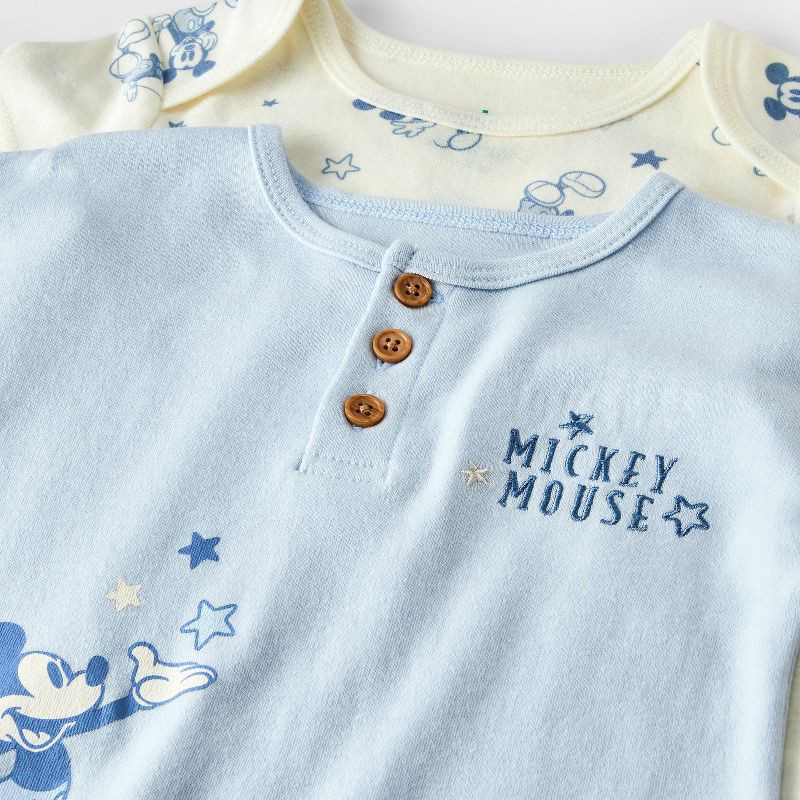 - Includes one in cream color with Mickey and star prints and one in blue with a Mickey graphic over one pocket and embroidered "Mickey Mouse" text