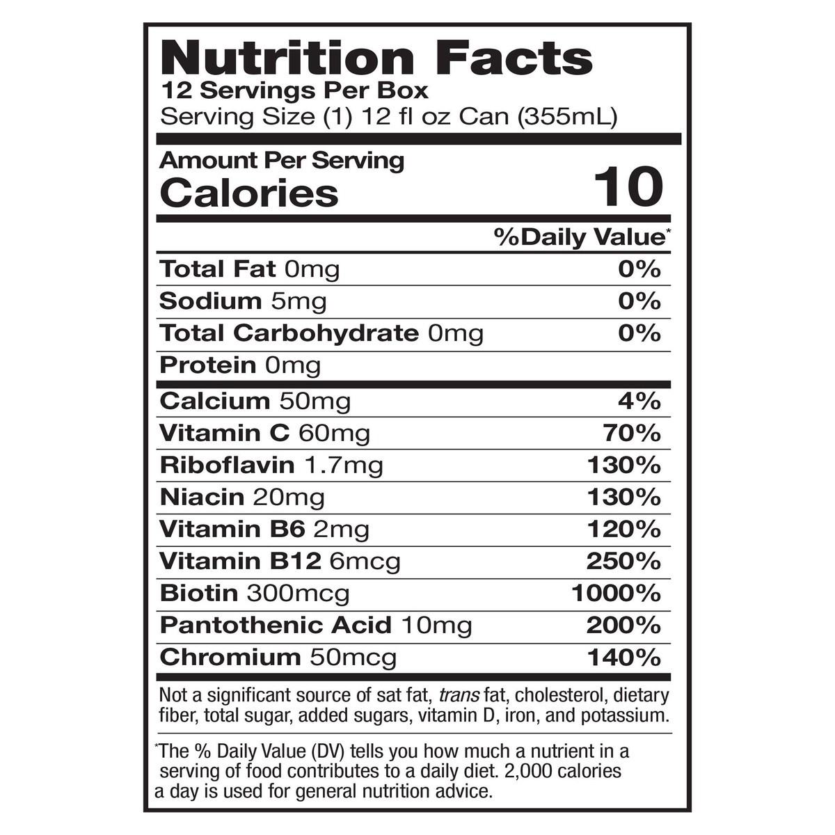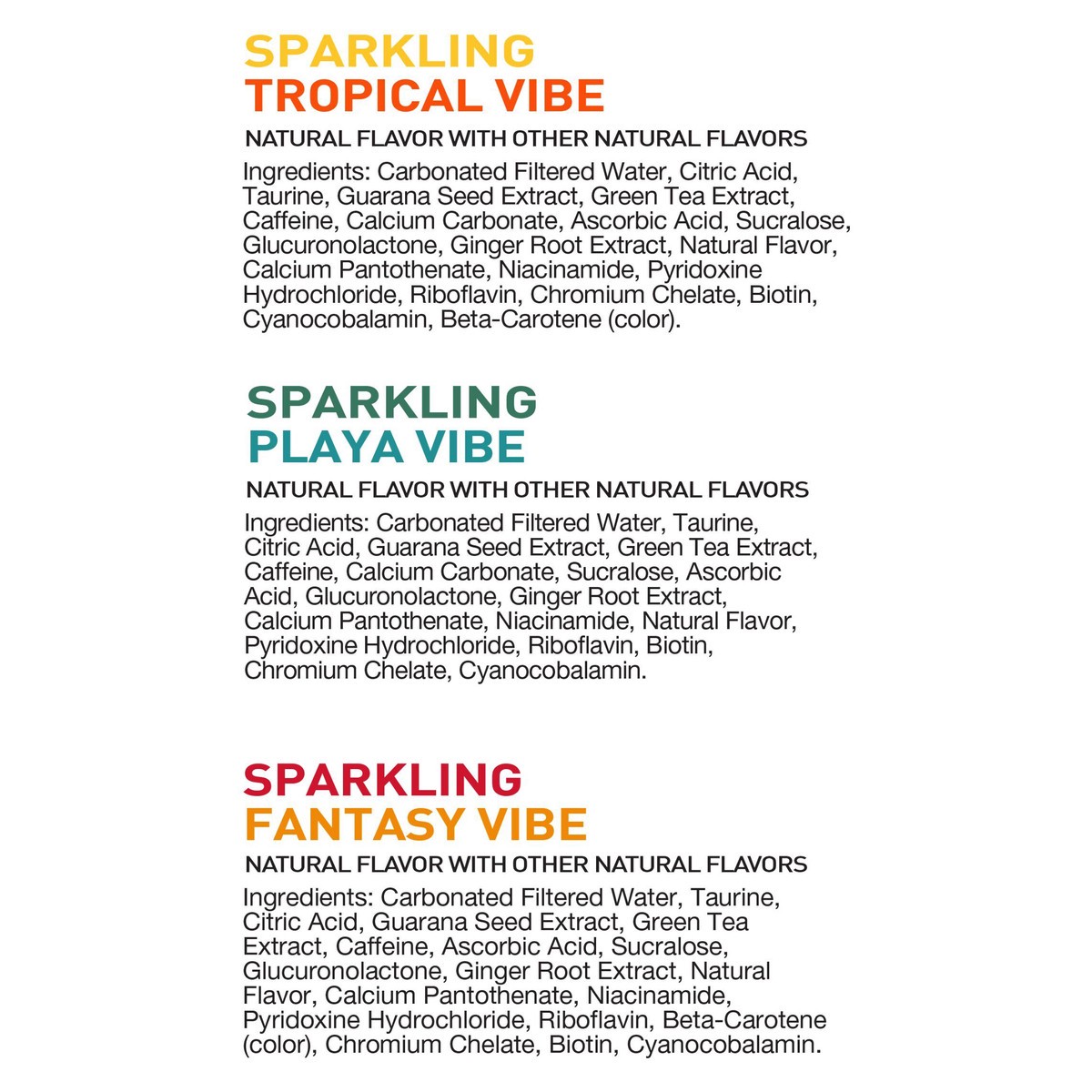 Sparkling Tropical Vibe: Carbonated Filtered Water, Citric Acid, Taurine, Guarana Seed Extract, Green Tea Extract, Caffeine, Calcium Carbonate, Ascorbic Acid, Sucralose, Glucuronolactone, Ginger Root …