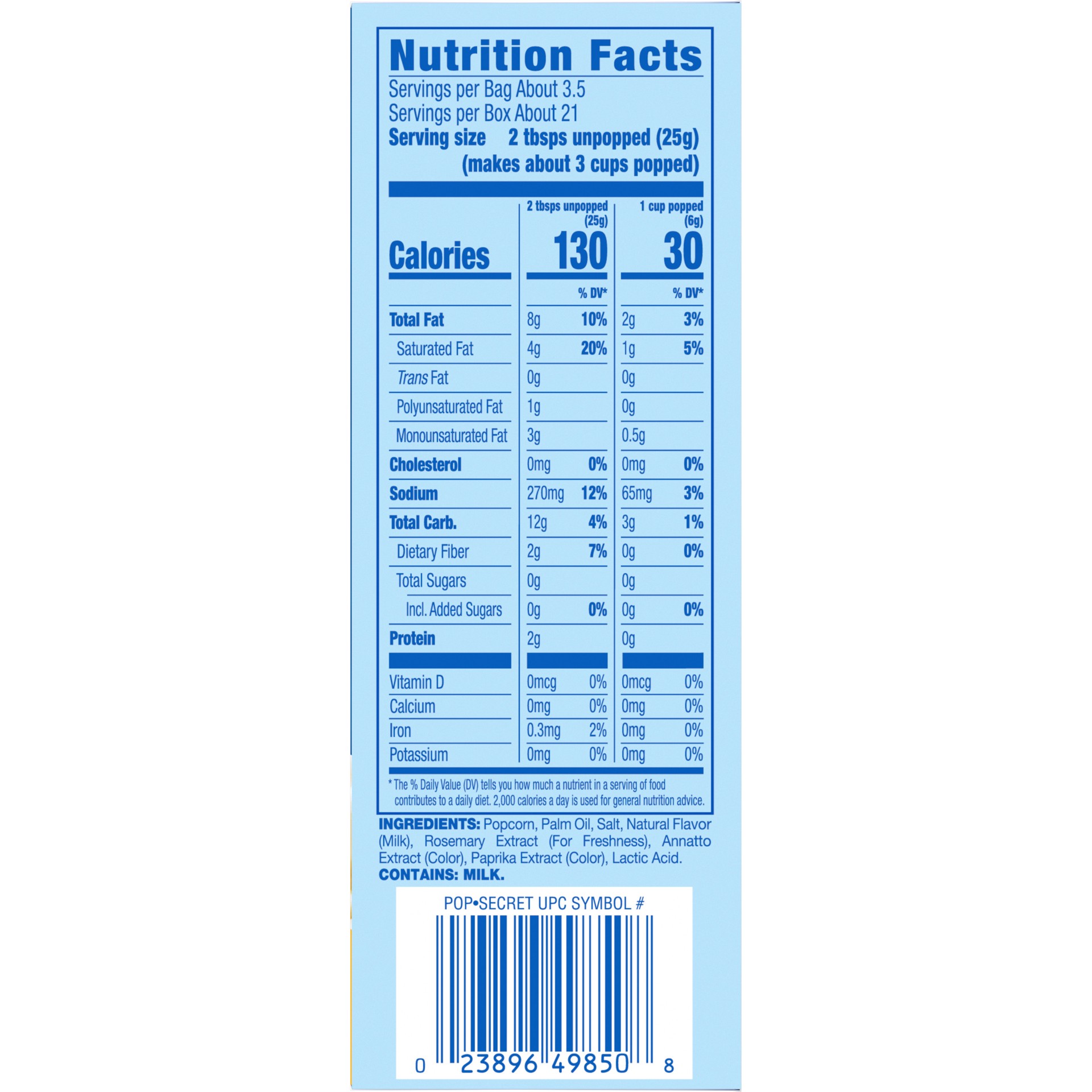 INGREDIENTS: POPCORN, PALM OIL, SALT, NATURAL FLAVOR (MILK), ROSEMARY EXTRACT (FOR FRESHNESS), ANNATTO EXTRACT (COLOR), PAPRIKA EXTRACT (COLOR), LACTIC ACID. CONTAINS: MILK