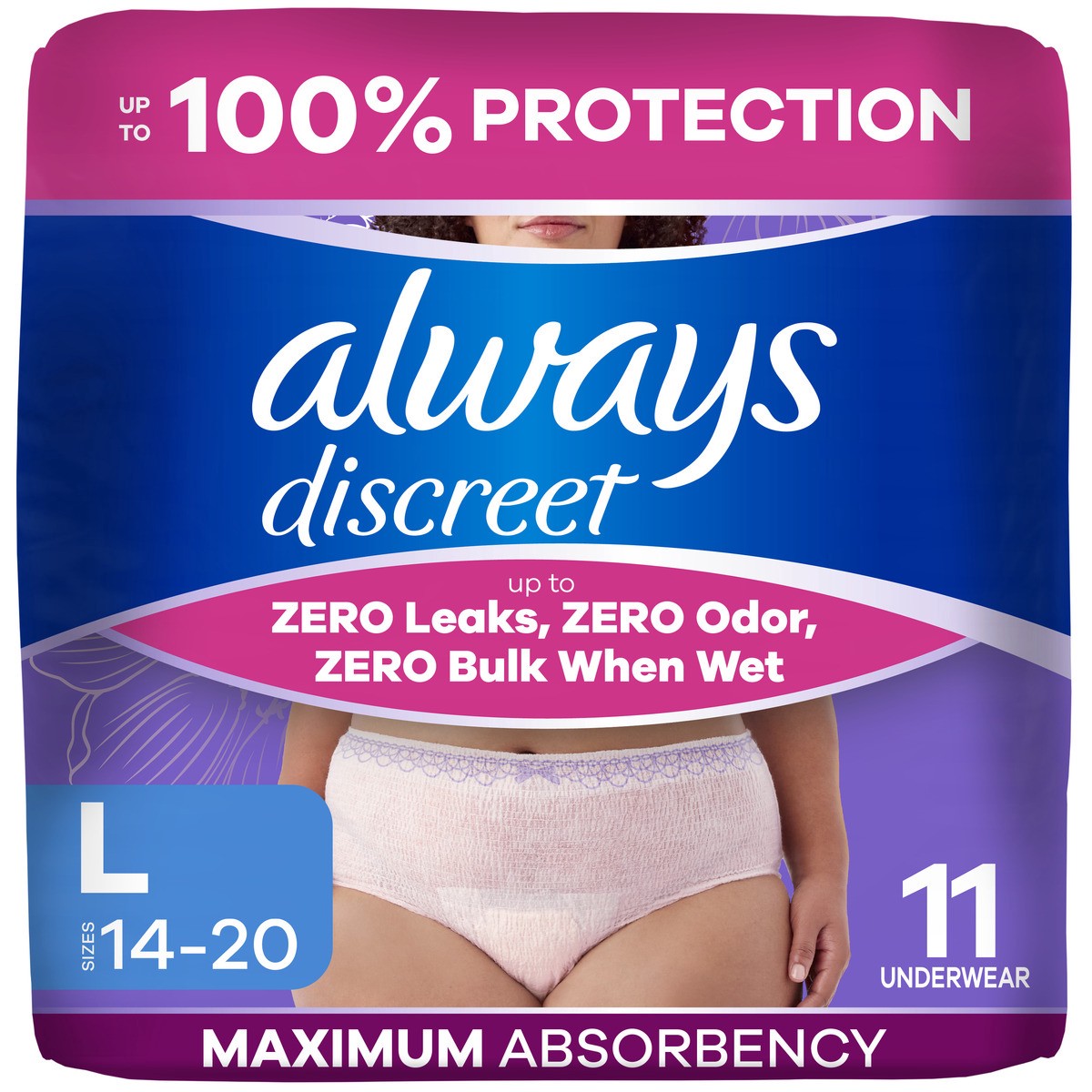 Always Discreet Adult Incontinence Underwear for Women and Postpartum Underwear, L, Up to 100% Bladder Leak Protection, 11 CT