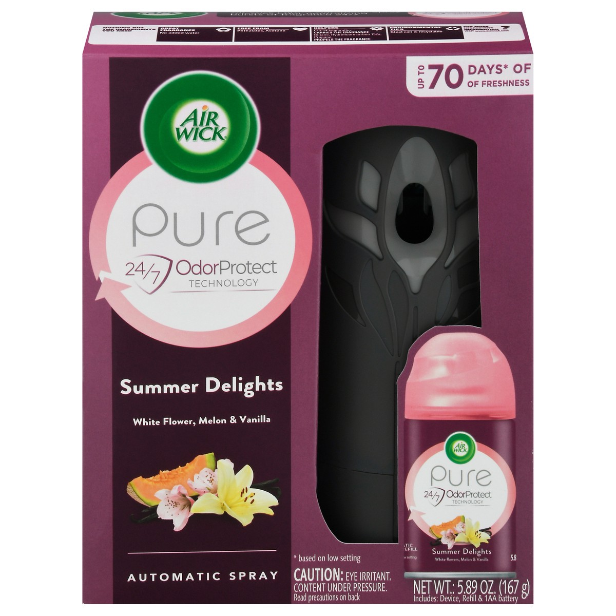 Up to 70 days (based on low setting) of freshness. 24/7 Odor protect technology. Includes: Device, refill & 1AA battery. Air Wick Pure Automatic Spray releases odor neutralizing bursts of fragrance 24…