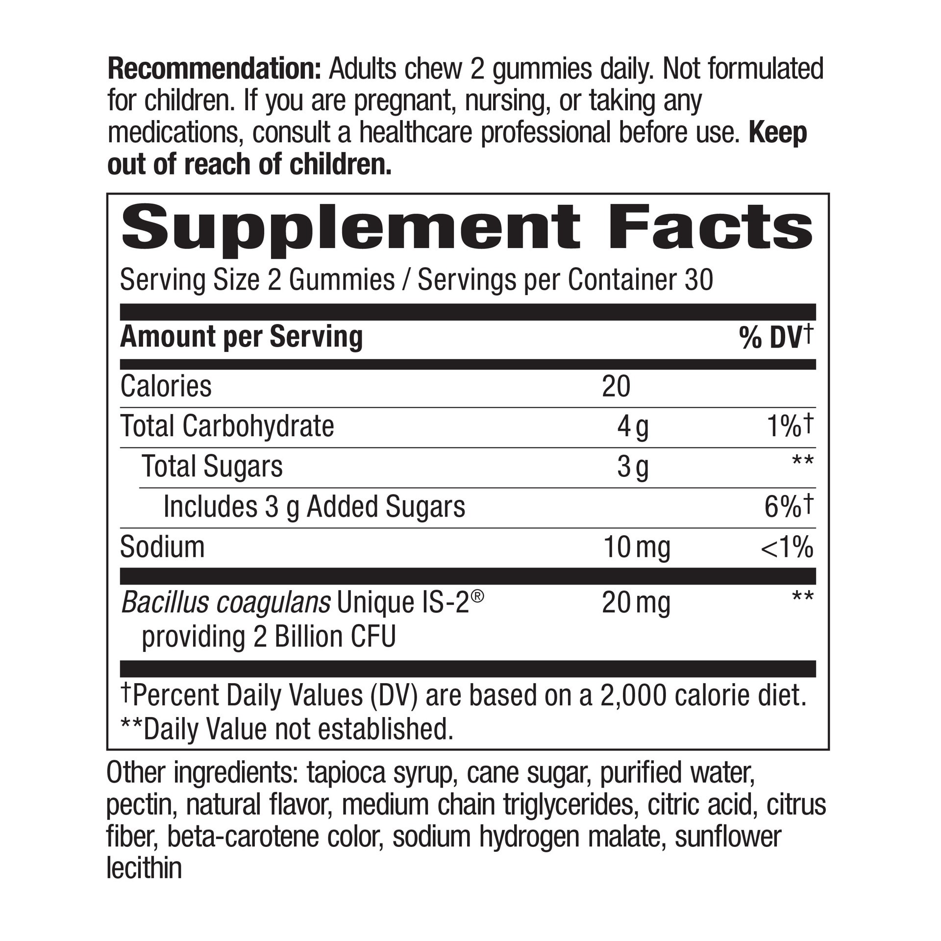 Bacillus coagulans Unique IS-2 providing 2 Billion CFU; Organic Tapioca Syrup; Cane Sugar; Purified Water; Pectin; Natural Flavor; Medium Chain Triglycerides; Citric Acid; Citrus Fiber; Beta-Carotene …