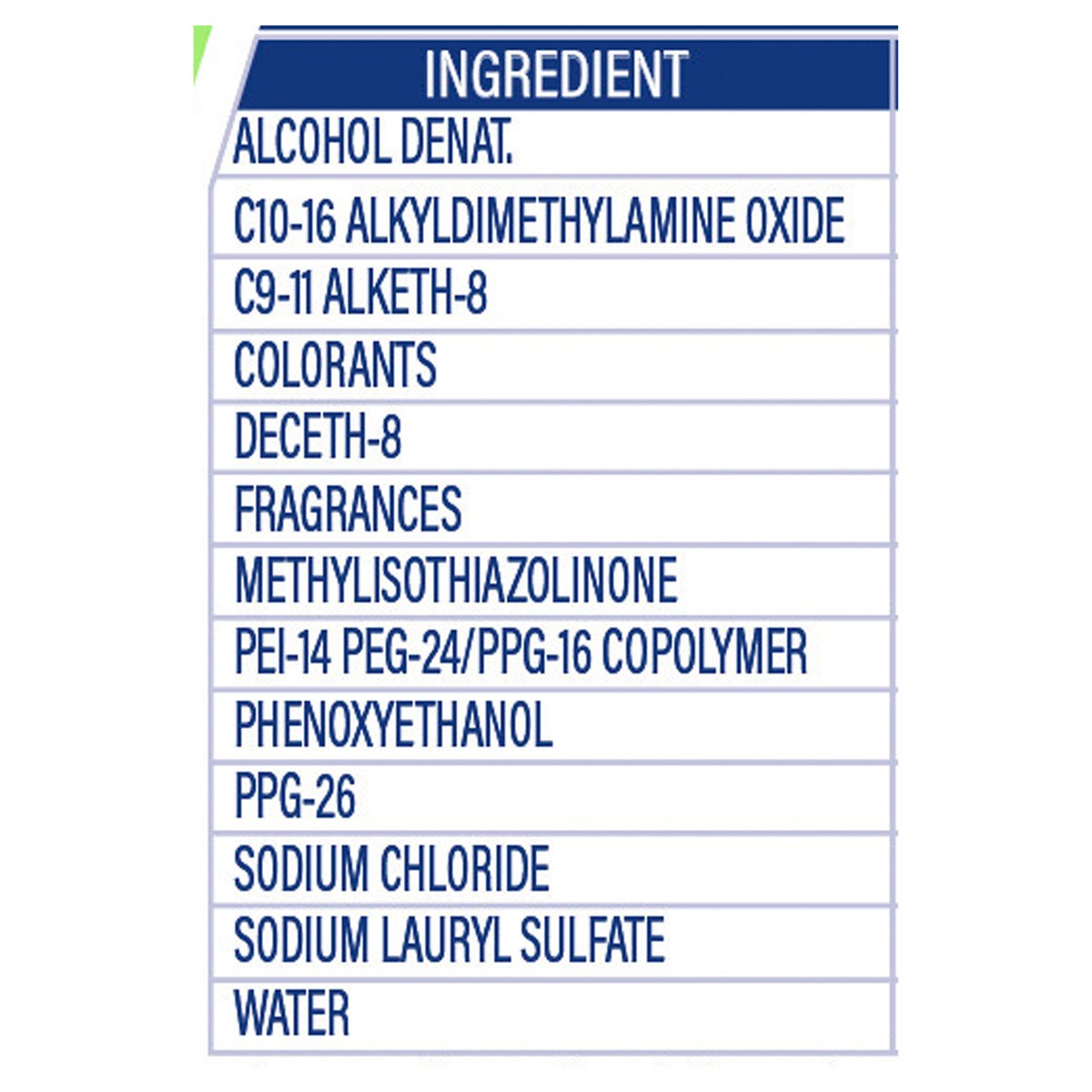 Alcohol Denat., C10-16 Alkyldimethylamine Oxide, C9-11 Alketh-8, Colorants, Deceth-8, Fragrances, Methylisothiazolinone, PEI-14 PEG-24/PPG-16 Copolymer, Phenoxyethanol, PPG-26, Sodium Chloride, Sodium…