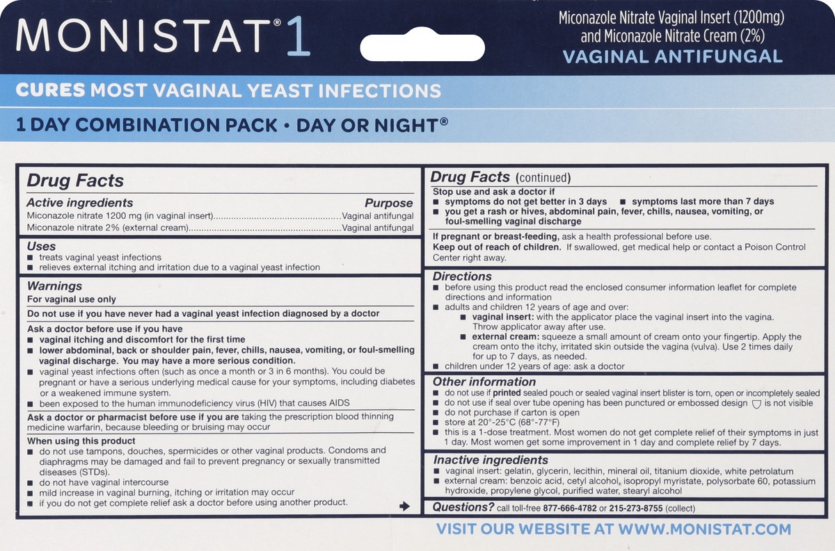 Active Ingredients: Miconazole Nitrate (1200 mg) (in Vaginal Insert), Miconazole Nitrate (2%) (External Cream). Purpose: Vaginal Antifungal. Vaginal Antifungal. Inactive Ingredients: Vaginal Insert: G…