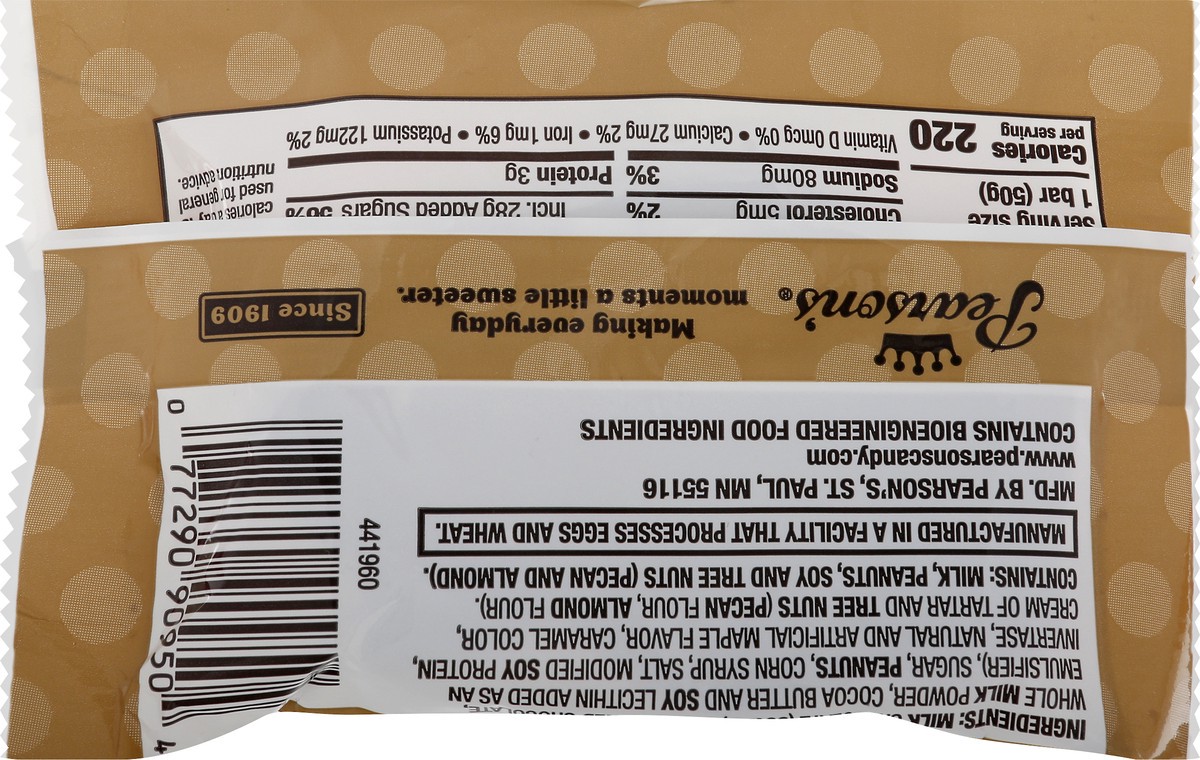 Real milk chocolate, roasted peanuts, and maple nougat. Gluten free. Contains a bioengineered food ingredients. Making everyday moments a little sweeter. Since 1909. www.pearsonscandy.com. Made in the…