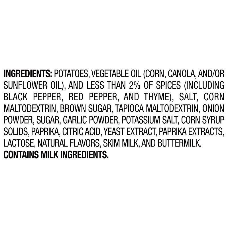 Potatoes, Vegetable Oil (Corn, Canola, and/or Sunflower Oil), and Less than 2% of Spices (Including Black Pepper, Red Pepper, and Thyme), Salt, Corn Maltodextrin, Brown Sugar, Tapioca Maltodextrin, On…