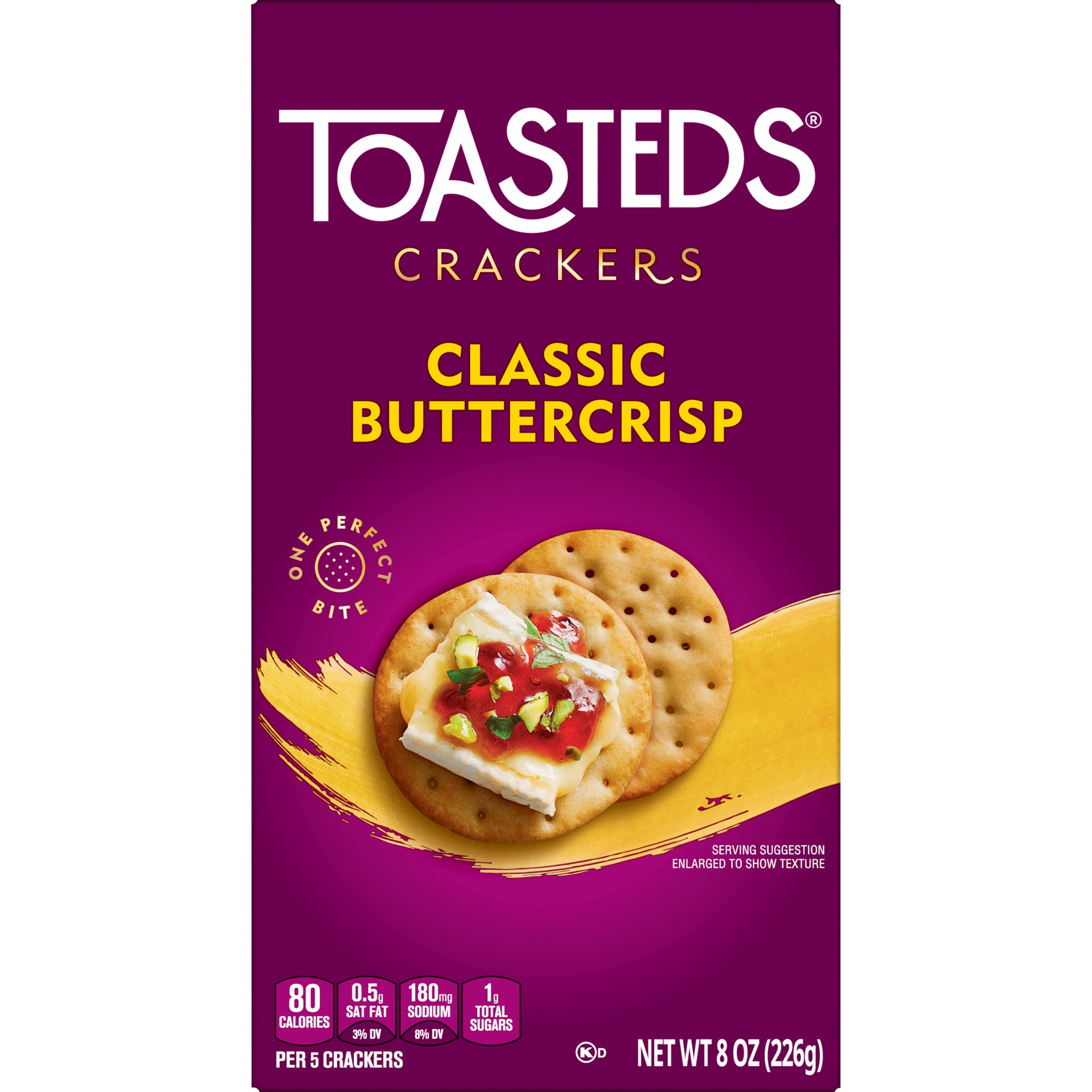 Take your entertaining to the next level with Toasteds Classic Buttercrisp crackers. These lightly toasted crackers bring that classic buttercrisp flavor and are toasted to perfection. Made without hi…