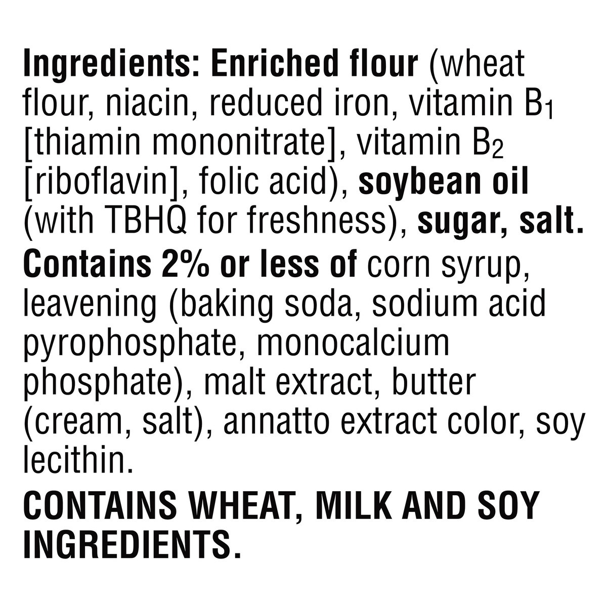 Enriched Flour (Wheat Flour, Niacin, Reduced Iron, Vitamin B1 [Thiamin Mononitrate], Vitamin B2 [Riboflavin], Folic Acid), Soybean Oil (with TBHQ for Freshness), Sugar, Salt. Contains 2% or Less of Co…