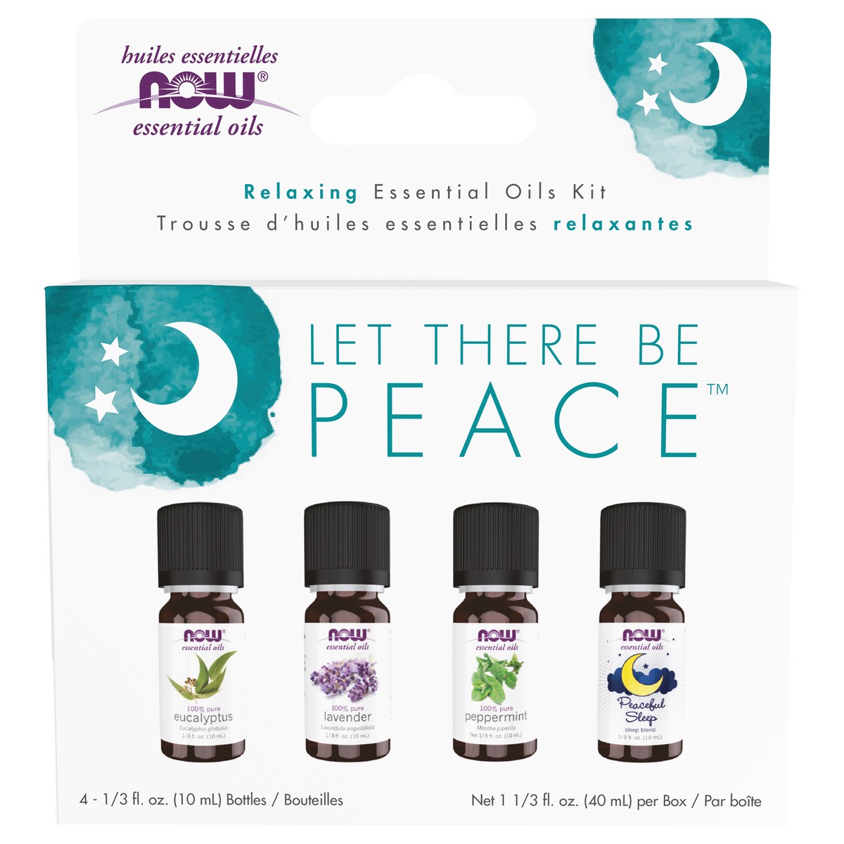 4 - 1/3 fl oz (10 ml) bottles. Let there be peace & quiet. 100% pure lavender; 100% pure eucalyptus; peaceful sleep; 100% pure peppermint. After a full day of work, errands, social engagements, kids, …