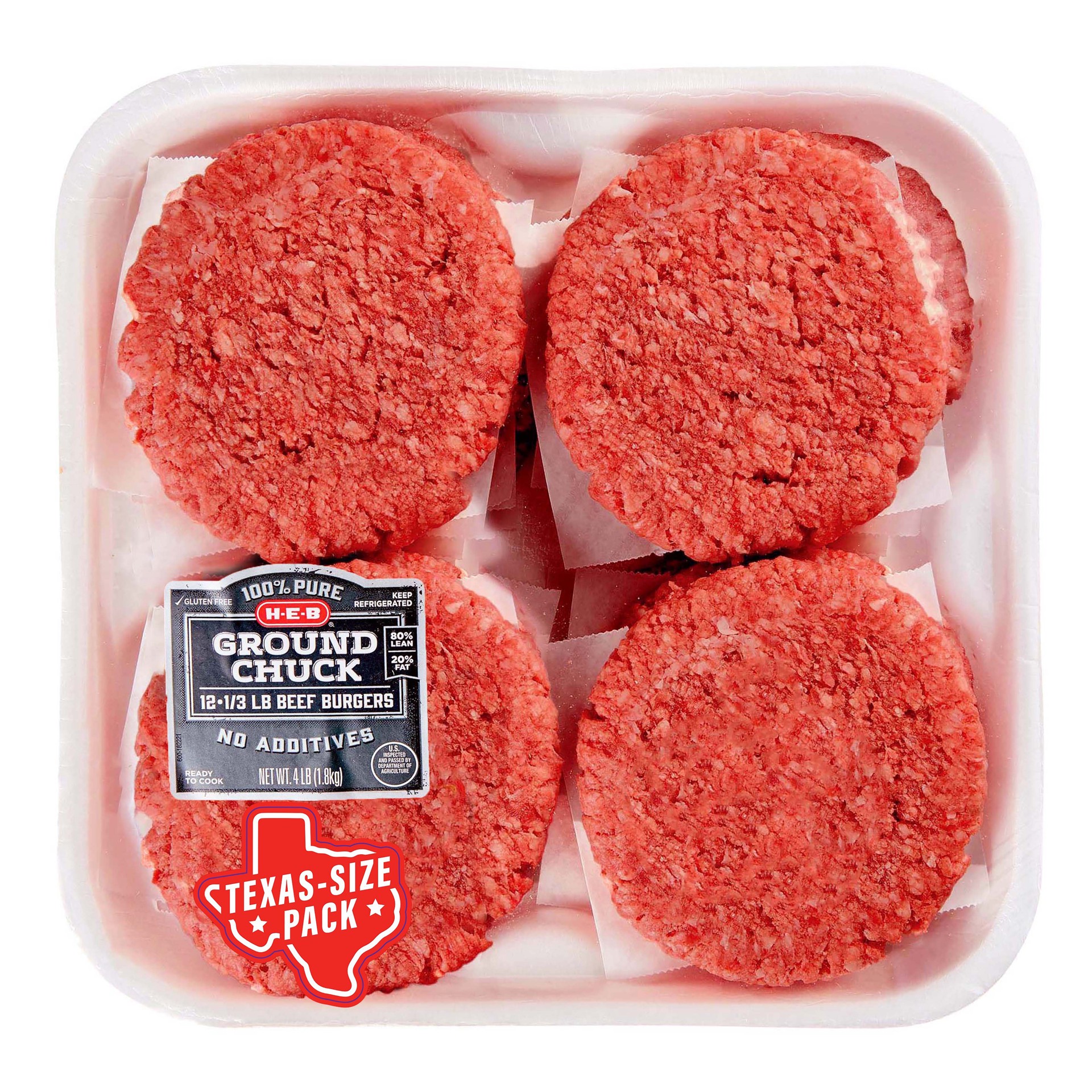H-E-B Ground Beef Chuck 1/3 lb Burgers Patties, 80% Lean - Texas-Size Pack