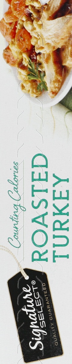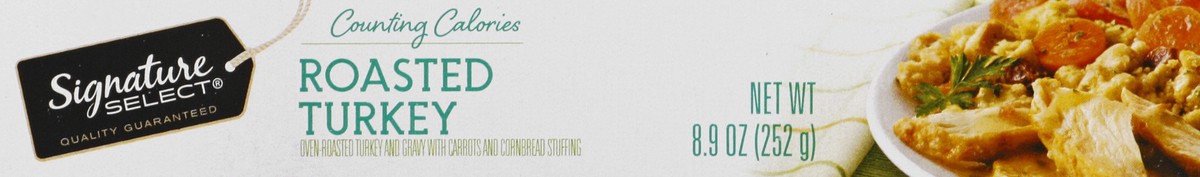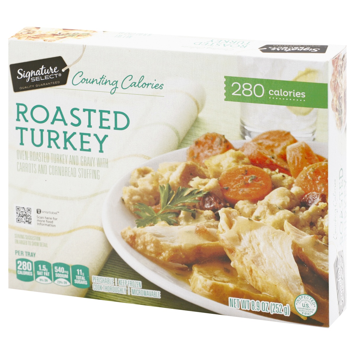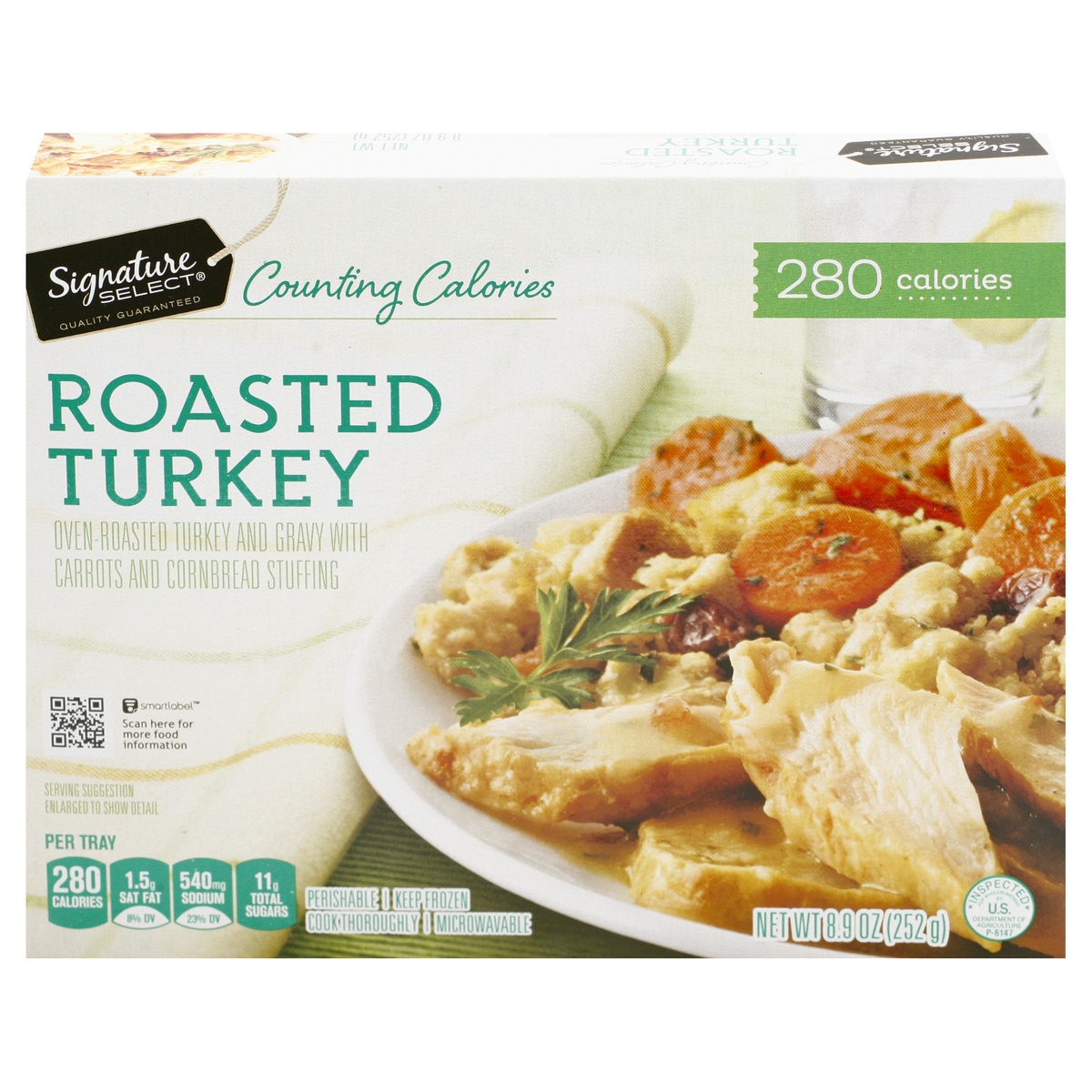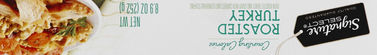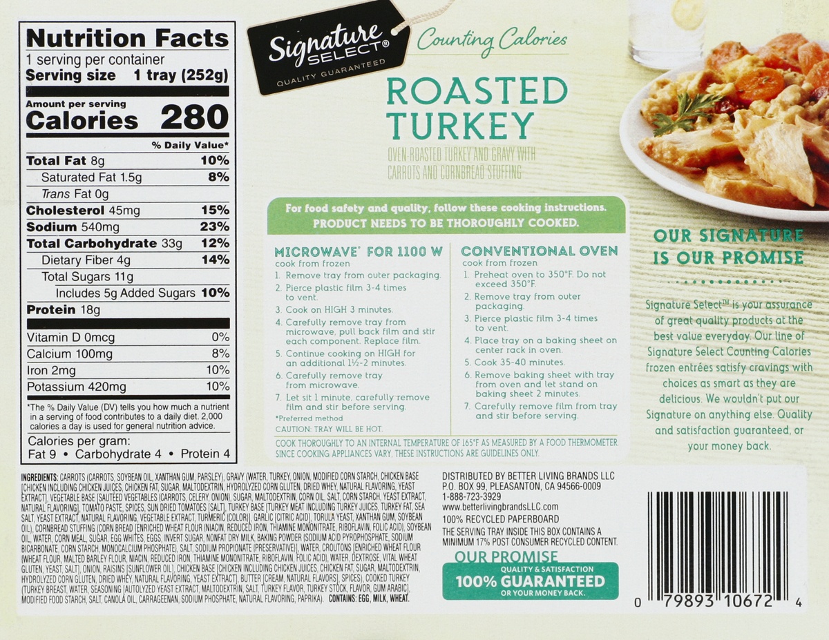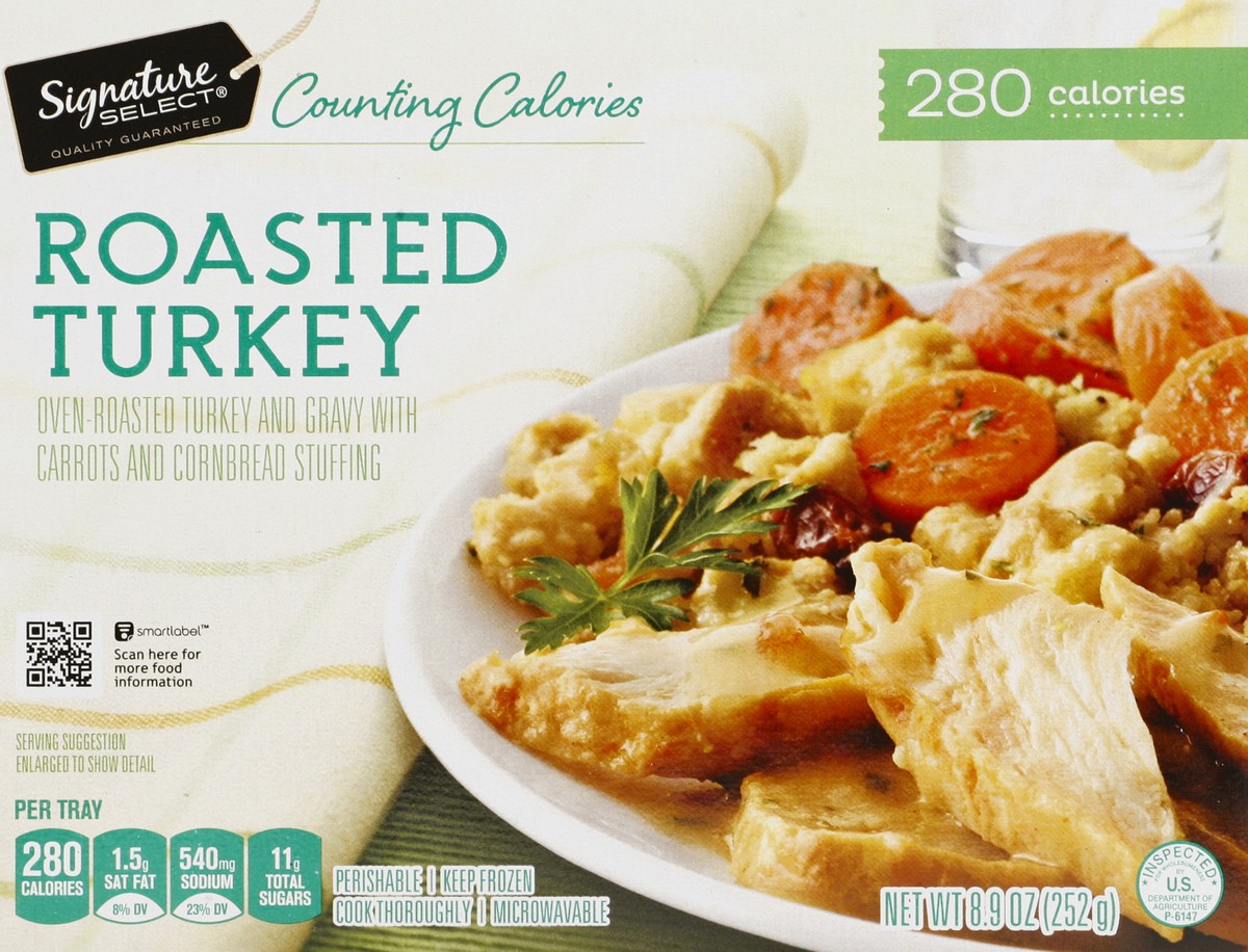 Oven roasted turkey and gravy with carrots and cornbread stuffing. Per Tray: 280 calories; 1.5 g sat fat (8% DV); 540 mg sodium (23% DV); 11 g total sugars. Microwaveable. Our Signature is our Promise…