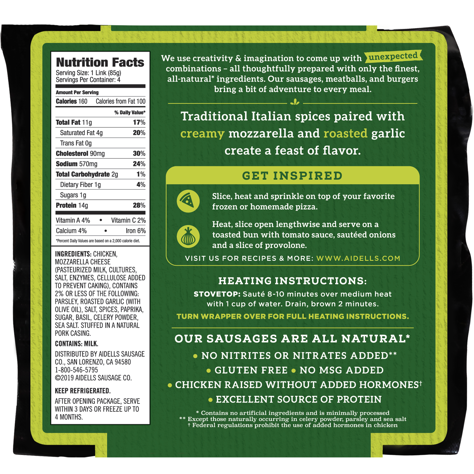 Enjoy the delicious flavors of Italy with Aidells Italian Style with Mozzarella Cheese Smoked Chicken Sausage. Made with mozzarella cheese, roasted garlic, and hardwood smoked chicken, this all-natura…