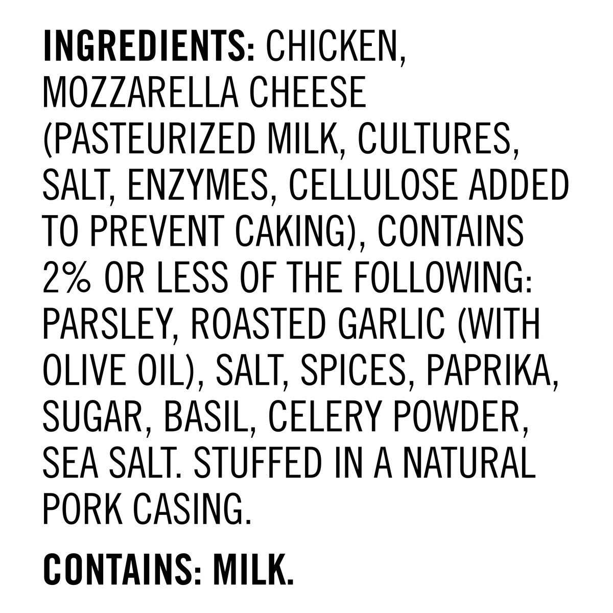 Chicken, mozzarella cheese (pasteurized milk, cultures, salt, enzymes, cellulose added to prevent caking), contains 2% or less of the following: parsley, roasted garlic (with olive oil), salt, spices,…