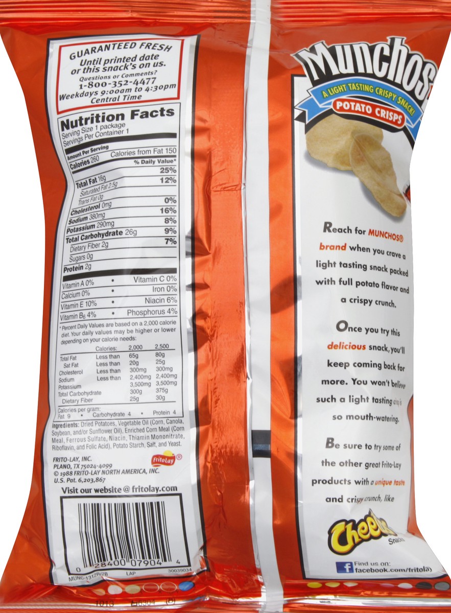 A light tasting crispy snack! Guaranteed fresh. Reach for Munchos brand when you crave a light tasting snack packed with full potato flavor and a crispy crunch. Once you try this delicious snack, you'…