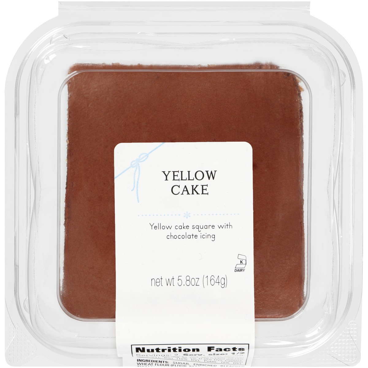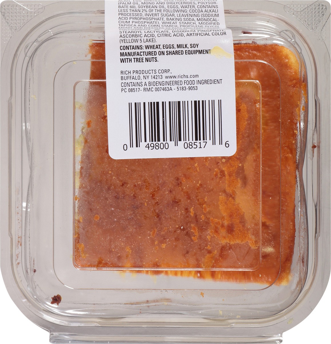 Yellow cake square with chocolate icing. Contains bioengineered food ingredient. www.richs.com.