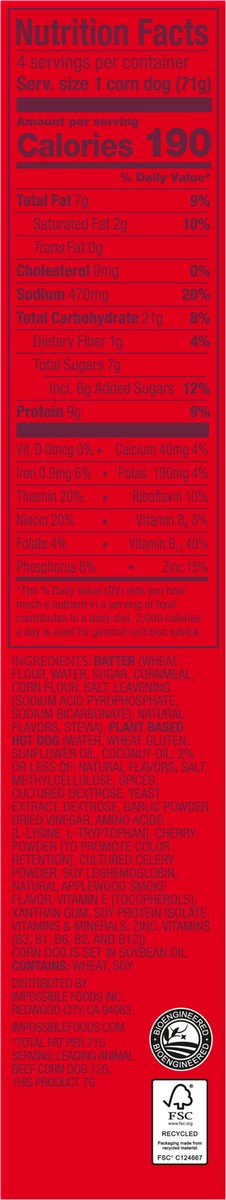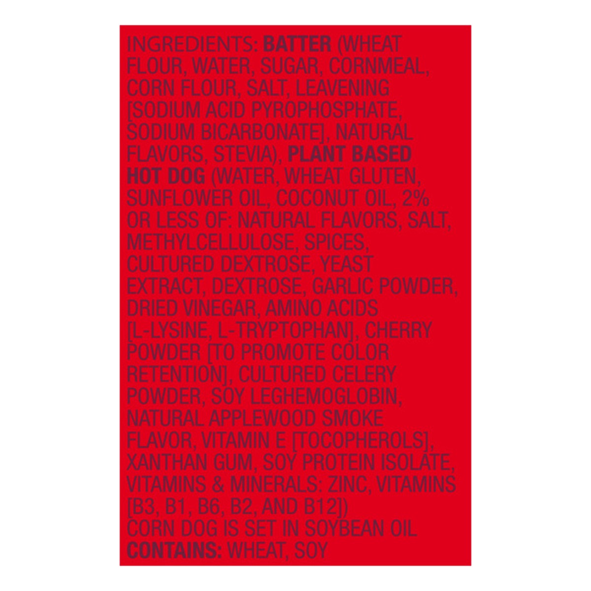 Batter (Wheat Flour, Water, Sugar, Cornmeal, Corn Flour, Salt, Leavening [Sodium Acid Pyrophosphate, Sodium Bicarbonate], Natural Flavors, Stevia), Plant Based Hot Dog (Water, Wheat Gluten, Sunflower …