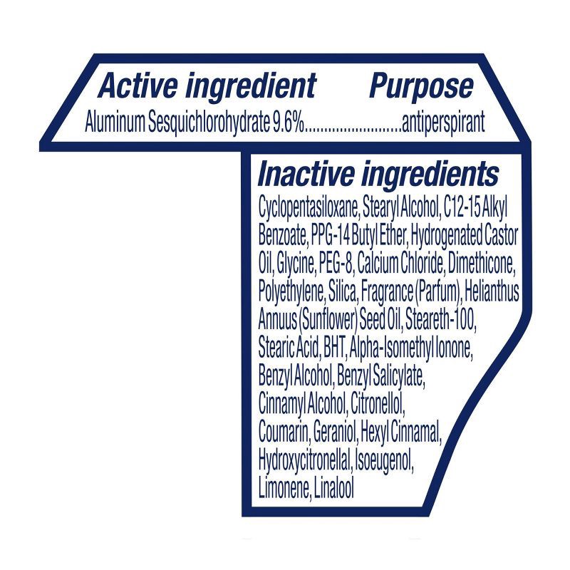 Active Ingredient: Aluminum Chlorohydrate (20. 2%)Inactive Ingredients: Butane, Hydrofluorocarbon 152a, Cyclopentasiloxane, Isobutane, Ppg-14 Butyl Ether, Helianthus Annuus (Sunflower) Seed Oil, Diste…
