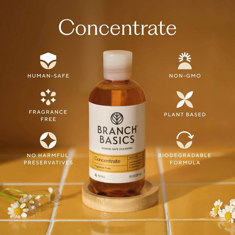 - Sustainable & Cost-Effective Refill System: Designed to reduce waste, this 8-ounce plastic bottle of Concentrate makes 6 All-Purpose Cleaners, or 3 Bathroom Cleaners, or 5 Stain Removers. Just add water to Branch Basics bottles (sold separately) for safe cleaning made simple.
