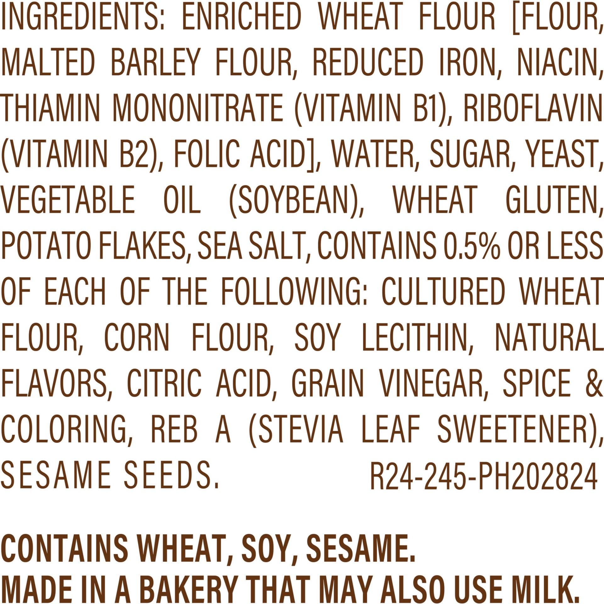 Contains sesame, soy, wheat. made in a facility that may also use milk.