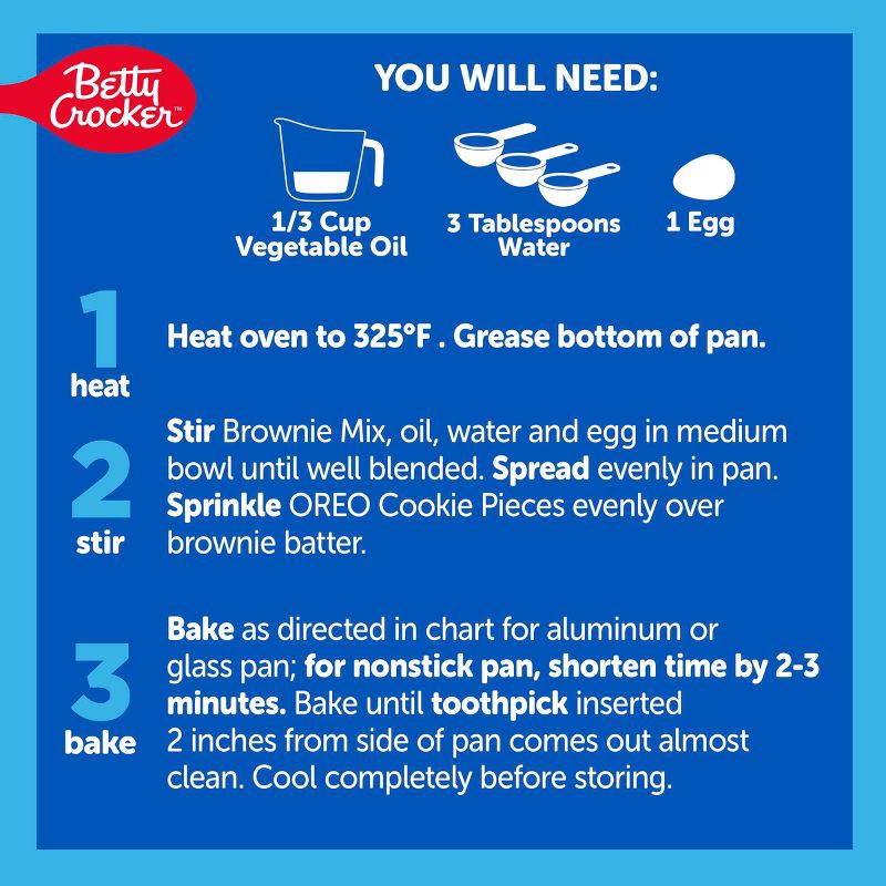 - BETTY CROCKER & OREO: Betty Crocker Brownie Mix with real OREO Cookie Pieces you can sprinkle on top of the batter before baking