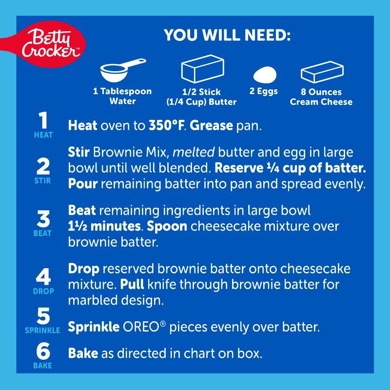 - REAL OREO COOKIE PIECES: This baking mix makes it easy to prepare an OREO brownie base topped with cheesecake swirl and OREO Cookie Pieces on top