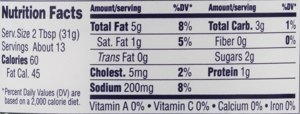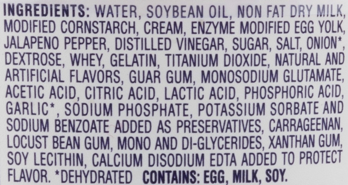 Skim Milk, Soybean Oil, Water, Modified Cornstarch, Contains 2% or Less of: Cream, Enzyme Modified Egg Yolk, Jalapeno Pepper, Distilled Vinegar, Sugar, Salt, Onion*, Dextrose, Whey, Gelatin, Titanium …