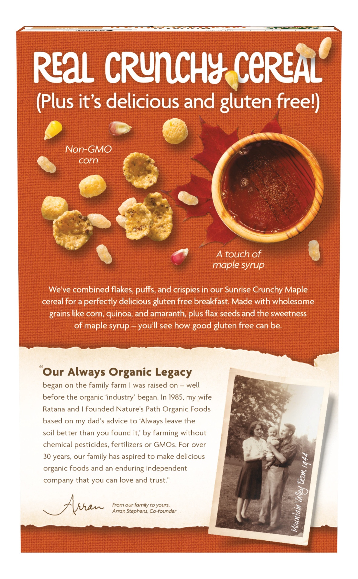 Nature''s Path Sunrise Crunchy Maple cereal is a deliciously crunchy combination of gluten free cereal flakes, organic corn puffs and rice crispies, all coated with real organic maple syrup. For too l…
