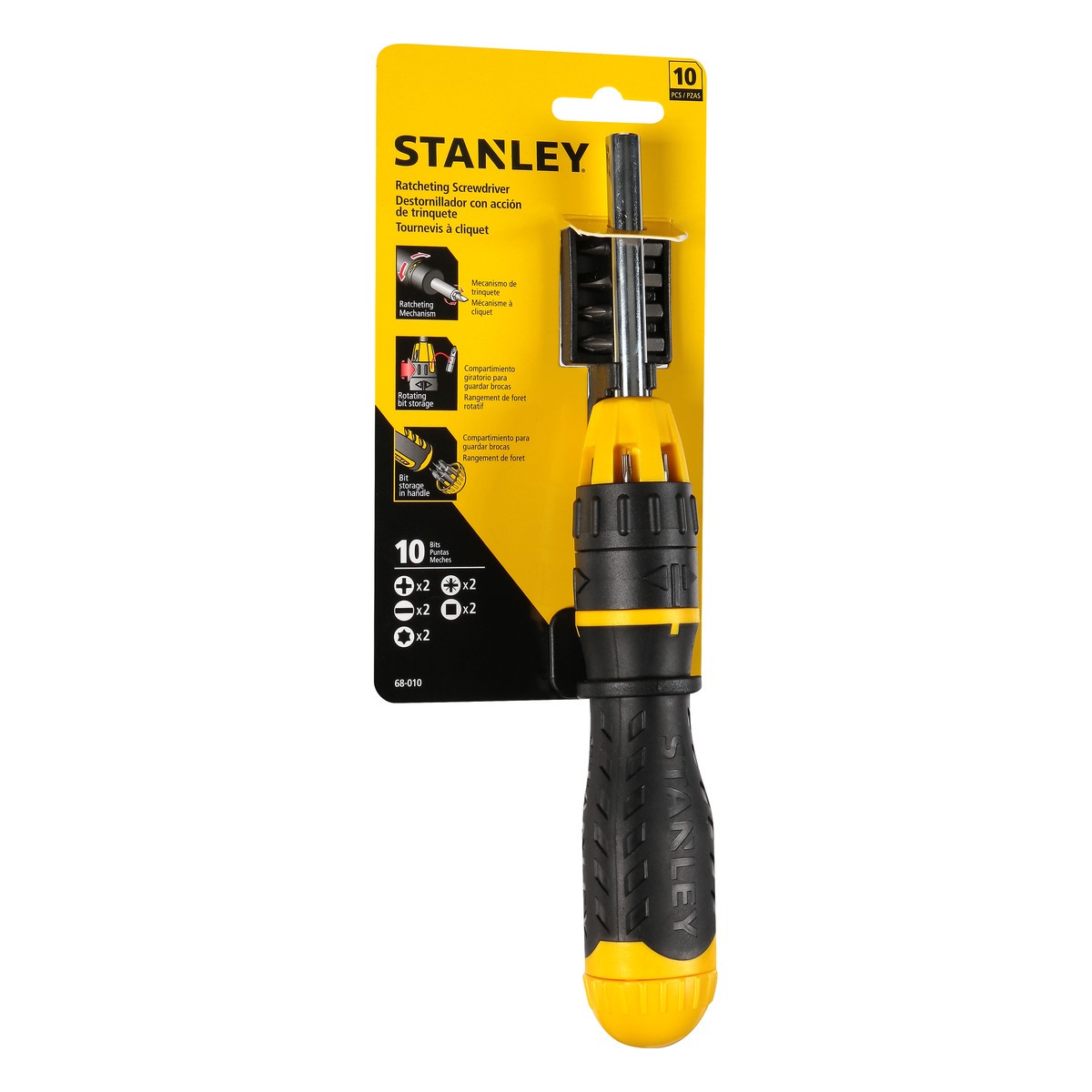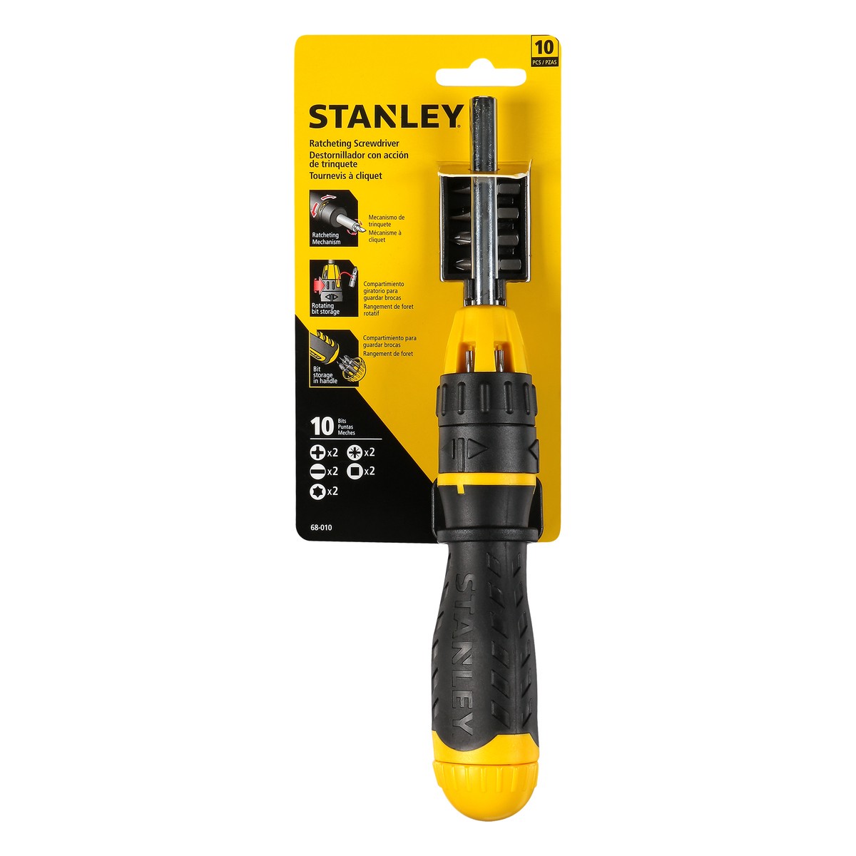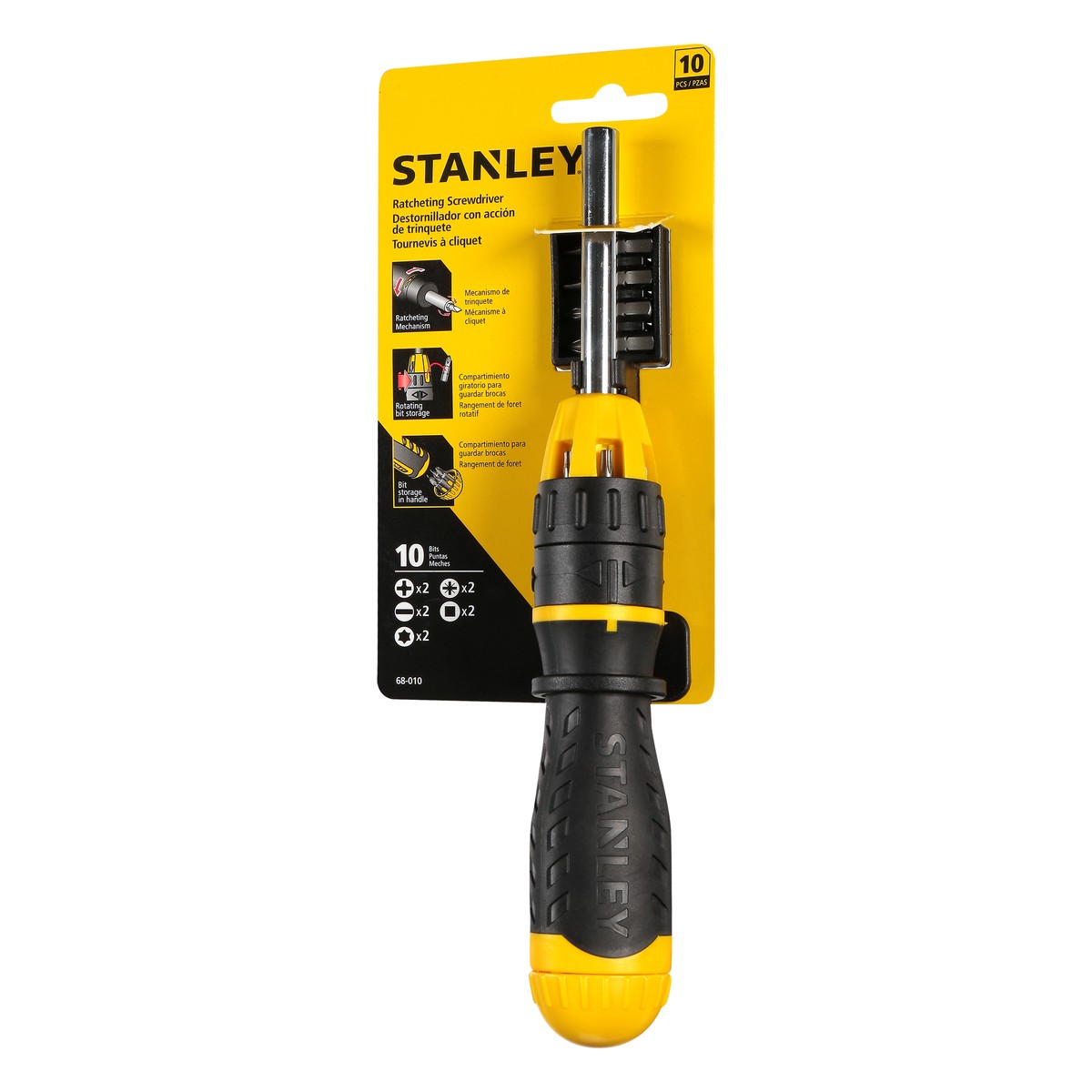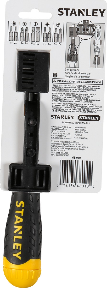 10 Pieces. Ratcheting Mechanism. Rotating bit storage. Bit storage in handle. 10 Bits. Storage rack. U.S. & Canada only. www.stainleytools.com. Made in China.